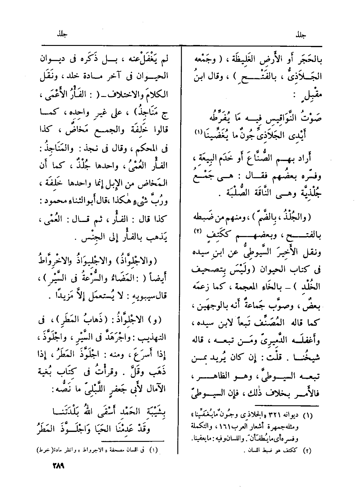 (والجُلْذُ، بِالضَّم) ، وَمِنْهُم من ضَبطه بِالْفَتْح، وَبَعْضهمْ ككَتِفٍ وَنقل الأَخِيرَ السَّيوطِيُّ عَن ابنِ سَيّده فِي كتاب الْحَيَوَان (ولَيْسَ بِتصحيفِ الخُلْدِ) بالخَاءِ الْمُعْجَمَة، كَمَا زعمَه بعضٌ، وصوَّب جَماعةٌ أَنه بالوجهَين، كَمَا قَالَه المُصَنِّف تَبعاً لِابْنِ سَيّده، وأَغفلَه الدَّمِيرِيّ ومَن تبعه، قَالَه شيخُنا. قلْت: إِن كَانَ يُريد بِمن تبعه السيوطيَّ، وَهُوَ الظَّاهِر، فالأَمر بِخِلَاف ذَلِك، فإِن السيوطيّ لم يَغْفَلْ عَنهُ، بل ذَكَره فِي ديوَان الْحَيَوَان فِي آخر مَادَّة خلد، ونَقَلَ الكلامَ وَالِاخْتِلَاف (: الفَأْرُ الأَعْمَى، ج مَنَاجِذُ) ، على غيرِ واحِدِه، كَمَا قَالُوا خَلِفَة وَالْجمع مَخاضٌ، كَذَا فِي الْمُحكم، وَقَالَ فِي نجد: والمَنَاجِذُ: الفأْر العُمْيُ، وَاحِدهَا جُلْذٌ، كَمَا أَن المَخاض من الإِبل إِنما وَاحِدهَا خَلِفَة، ورُبَّ شيْءٍ هاكذا، قَالَ أَبو الثناءِ مَحْمُود: كَذَا قَالَ: الفأْر، ثمَّ قَالَ: العُمْى، يَذهب بالفأْر إِلى الجِنْس.