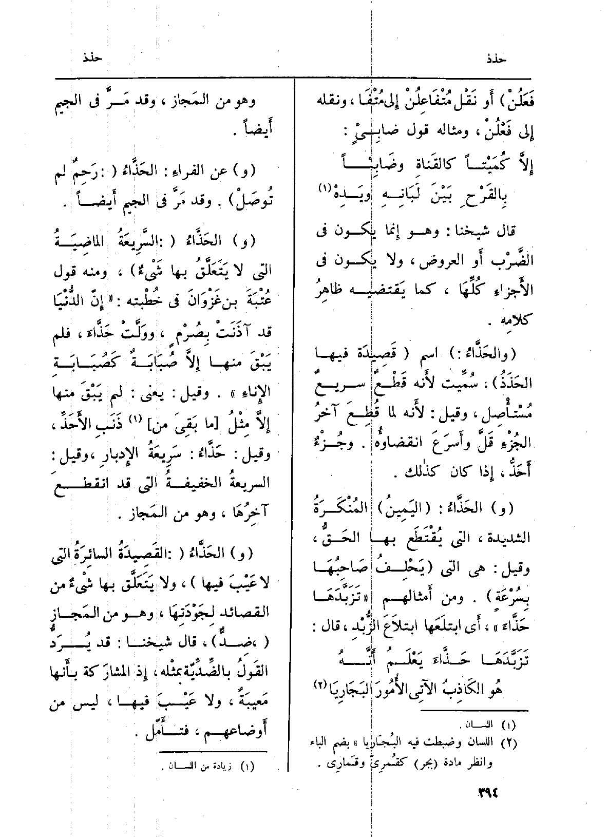 (و) الحَذَّاءُ (: السَّرِيعَةُ الماضِيَةُ الَّتِي لَا يَتَعَلَّقُ بهَا شَيْءٌ) ، وَمِنْه قَول عُتْبَةَ بن غَزْوَانَ فِي خُطْبته: (إِنّ الدُّنْيَا قد آذَنَتْ بِصُرْمغ، ووَلَّتْ! حَذَّاءَ، فَلم يَبْقَ مِنْهَا إِلاَّ صُبَابَةٌ كُصَبَابَةِ الإِناءِ) . وَقيل: يَعْنِي: لم يَبْقَ مِنْهَا إِلاَّ مِثْلُ (مَا بَقِيَ من) ذَنَبِ الأَحَذِّ، وَقيل: حَذَّاءُ: سَرِيعَةُ الإِدبارِ، وقيلِ: السريعةُ الخفيفةُ الَّتِي قد انقطعَ آخِرُهَا، وَهُوَ من المَجاز.