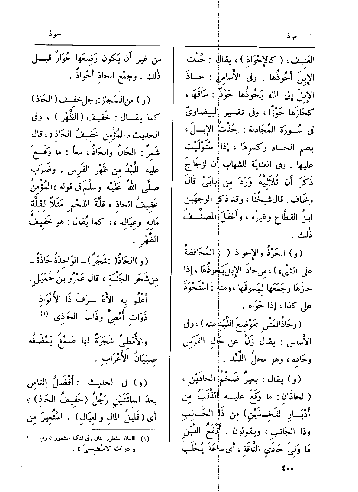(و) يُقَال: بعيرٌ ضَخْمُ الحاذَيْنِ، (} الحاذَانِ: مَا وَقَعَ عَلَيْهِ الذَّنَبُ مِن أَدْبَارِ الفخِذَيْنِ) مِن ذَا الجَانِبِ وَذَا الجَانبِ، وَيَقُولُونَ: أَنْفَعُ اللَّبَنِ مَا وَلِيَ {- حَاذَيِ النَّاقَةِ، أَي ساعَةَ يُحلَب من غير أَن يَكون رَضِعَها حُوَارٌ قبل ذالك. وجمْع} الحاذِ {أَحْوَاذٌ.