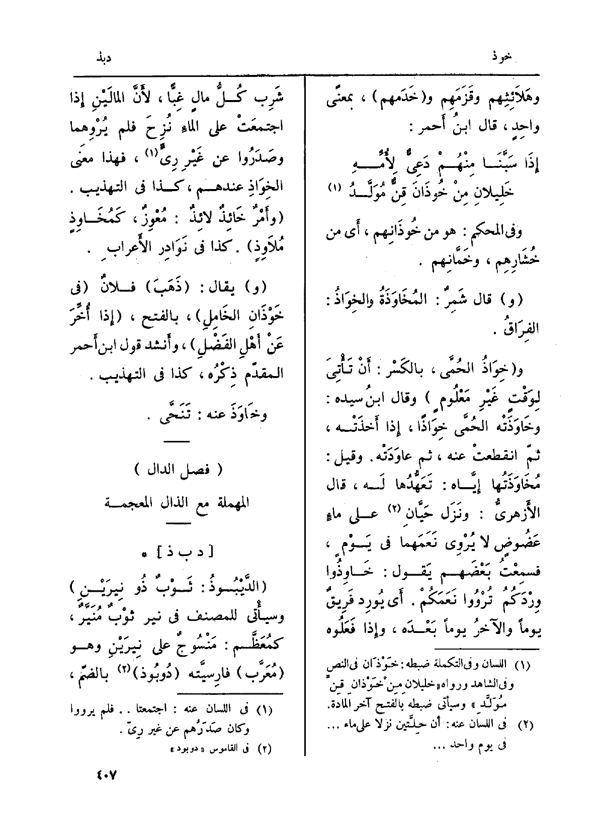 : (الدَّيْبُوذُ: ثَوْبٌ ذُو نِيرَيْنِ) وسيأْتي للمصف فِي نير ثوْبٌ مُنَيَّرٌ، كمُعَظَّم: مَنْسُوجٌ على نِيرَيْنِ وَهُوَ (مُعَرَّب) فارِسيَّته (دُوبُوذ) بالضمّ،