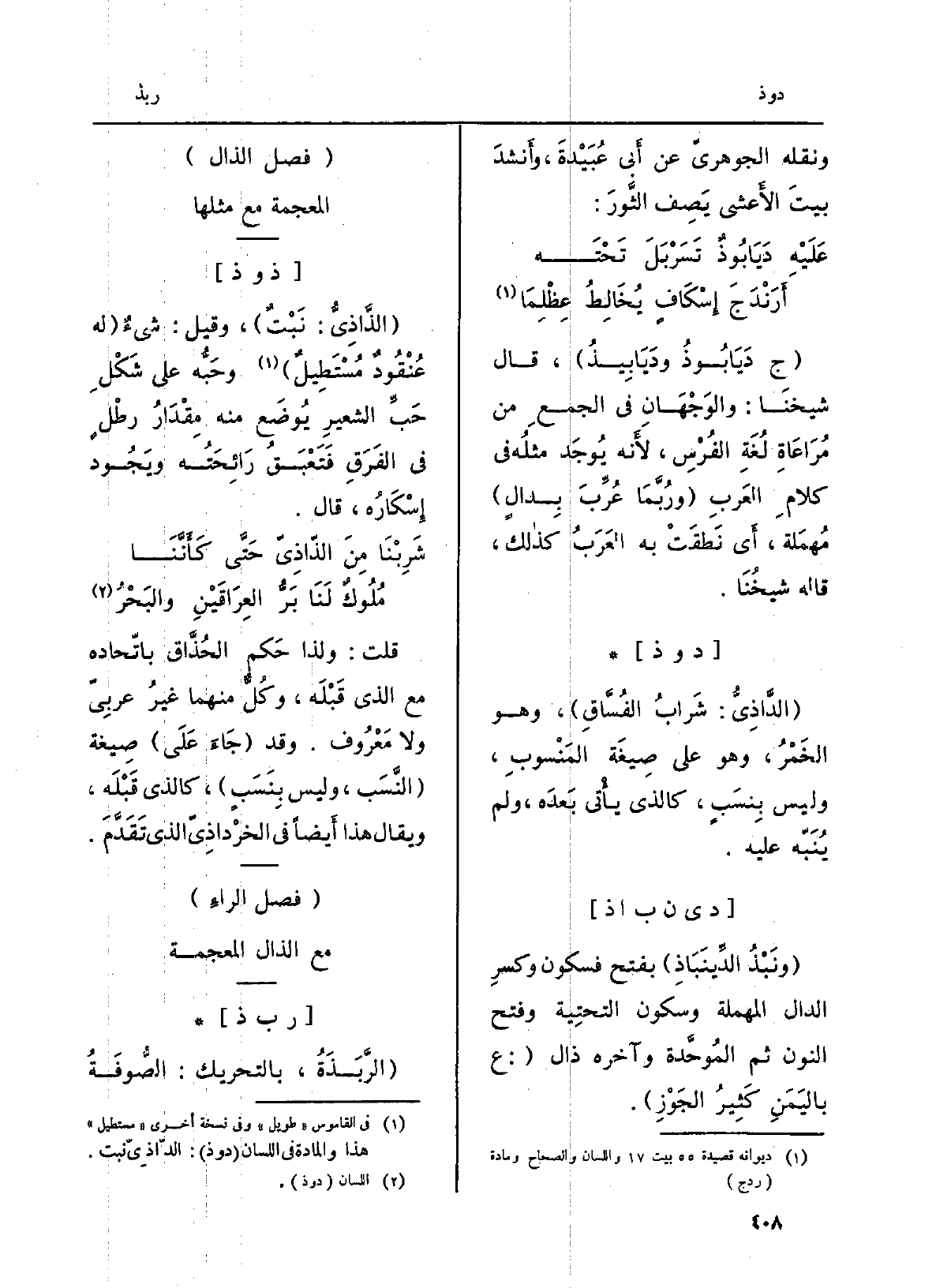 (ج دَيَابُوذُ ودَيَابِيذُ) ، قَالَ شيخنَا: والوَجْهَانِ فِي الجمعِ من مُرَاعَاةِ لُغَةِ الفُرْسِ، لأَنه يُوجَد مثلُه فِي كلامِ العَربِ (ورُبَّمَا عُرِّبَ بِدالٍ) مُهمَلة، أَي نَقطَتْ بِهِ العَرَبُ كذالك، قَالَه شيخُنَا.