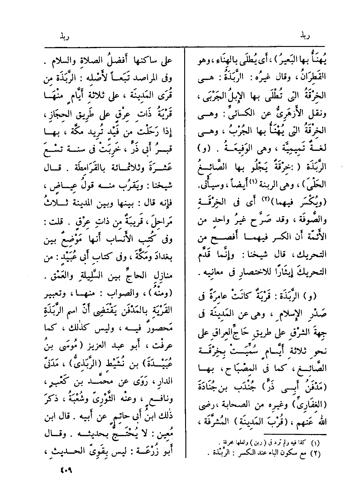 (و) الرَّبَذَة: قَرْيَةٌ كانَتْ عامِرَةً فِي صَدْرِ الإِسلامِ، وَهِي عَن المَدِينَة فِي جِهةَ الشرْقِ على طريقِ حَاجِّ العِراقِ على نحوِ ثلاثةِ أَيَّامٍ سُمِّيَتْ بِخِرْقَة الصَّائِغ، كَمَا فِي المِصْبَاح، بهَا (مَدْفَنُ أَبِي ذَرَ) جُنْدَب بن جُنَادَةَ (الغِفَارِيِّ) وغيرُه من الصحاب، رَضِي الله عَنْهُم. (قُرْبَ المَدِينَةِ) المُشرَّفَة، على ساكنها أَفضلُ الصلاةِ وَالسَّلَام. وَفِي المراصد تَبَعاً لأَصْلِه: الرَّبَذَة مِن قُرَى المَدِينَة، على ثلاثةِ أَيَّامٍ منْهَا قَرْيَةُ ذَاتِ عِرْقٍ على طَرِيق الحِجَازِ، إِذا رَحَلْت من فَيْدٍ تُرِيد مكَّة، بهَا قبرُ أَبي ذَرَ، خَرِبَتْ فِي سنة تسْعَ عَشرَةَ وثلاثمائة بالقَرَامِطَة. قَالَ شَيخنَا: ويَقرُب مِنْهُ قولُ عِياضٍ فإِنه قَالَ: بَينهَا وَبَين الْمَدِينَة ثلاثُ مَراحِلَ، قَريبَةٌ مِن ذاتِ عِرْقٍ. قلت: وَفِي كُتِب الأَنساب أَنها مَوْضِعٌ بَين بغدادَ ومَكَّة، وَفِي كتابِ أَبي عُبَيْدٍ: من منازِلِ الحاجِّ بَين السَّلِيلةِ والعَمْق. (ومنْهُ) ، وَالصَّوَاب: مِنْهَا، وتعبير القَرْيَةِ بالمَدْفَن يَقْتَضِي أَنّ اسْم الرَّبَذَةِ مَحصورٌ فِيهِ، وَلَيْسَ كذالك، كَمَا عرفْت، أَبو عبد الْعَزِيز (مُوسَى بنُ عُبَيْدَةَ) بن نُشَيْطٍ (الرَّبَذِيُّ) ، مَدَنيّ الدارِ، رَوَى عَن محمَّد بن كَعْبٍ، ونافعٍ، وعنْه الثَّوْرِيّ وشُعْبَةُ، ذكرَ ذالك ابنُ أَبي حاتِمٍ عَن أَبيه. قَالَ ابْن مُعِين: لَا يُحْتَجُّ بحَديثه. وَقَالَ أَبو زُرْعَة: لَيْسَ بِقَوِيّ الحديثِ،