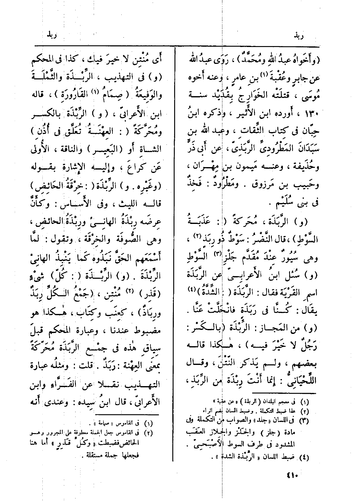 (و) الرَّبَذَة، مُحَركةً (: عَذَبَةُ السَّوْطِ) ، قَالَ النَّضْرُ: سَوْطٌ ذُو رِبَذٍ، وَهِي سُيُورٌ عِنْدَ مُقَدَّم جَلْزِ السَّوْطِ (و) سُئل ابنُ الأَعرابِيّ عَن الرَّبَذَة اسمِ القَرْيَة فَقَالَ: الرَّبَذَة (: الشِّدَّةُ) يقَال: كُنَّا فِي رَبَذَةٍ فانْحَلَّتْ عَنَّا (و) من المَجاز: الرِّبْذَة (بالكَسْر: رَجُلٌ لَا خَيْرَ فِيهِ) ، هاكذا فقاله بَعضهم، وَلم يَذكر النّتْنَ، وَقَالَ اللِّحْيَانِيُّ: إِما أَنْتَ رِبْذَة من الرِّبَذِ، أَي مُنْتِن لَا خيرَ فِيك، كَذَا فِي الْمُحكم (و) فِي التَّهْذِيب، الرِّبْذَة والثَّمْلَةَ والوَفِيعَةُ (صِمَامُ القَارُورَةِ) ، قَالَه ابْن الأَعرابيّ، (و) الرَّبْذَة بِالْكَسْرِ ومُحَرَّكَةً (: العِهْنَةُ تُعَلَّق فِي أُذُنِ) الشاةِ أَو (البَعِير) والناقة، الأُولى عَن كراعَ، وإِليه الإِشارة بقوله (وغَيْرِه. و) الرِّبْذَة (: خِرْقَةُ الحَائِضِ) قَالَه اللَّيْث، وَفِي الأَساس: وكأَنَّ عِرضَه رِبْذَةُ الهانِىء ورِبْذَةُ الحائضِ، وَهِي الصُّوفَة والخِرْقَة، وَتقول: لمَّا أَسْمَعَهم الحَقَّ نَبَذُوه كَما يَنْبِذُ الهانِىء الرِّبْذَةَ. (و) الرِّبْذَة (: كُلّ) شيْءٍ (قَذِر) مُنْتِن، (جَمْعُ الكُلِّ رِبَذٌ ورِبَاذٌ) ، كعِنَب وكِتَاب، هاكذا هُوَ مضبوط عندنَا، وَعبارَة الْمُحكم قبلَ سِياقِ هاذه فِي جمْع الرَّبَذَة مُحَرّكَةً بِمَعْنى العِهْنة: رَبَذٌ. قلت: ومثلُه عبارَة التَّهْذِيب نقلا عَن الفَرَّاءِ وَابْن الأَعرابيّ، قَالَ ابنُ سِيده: وَعِنْدِي أَنه
