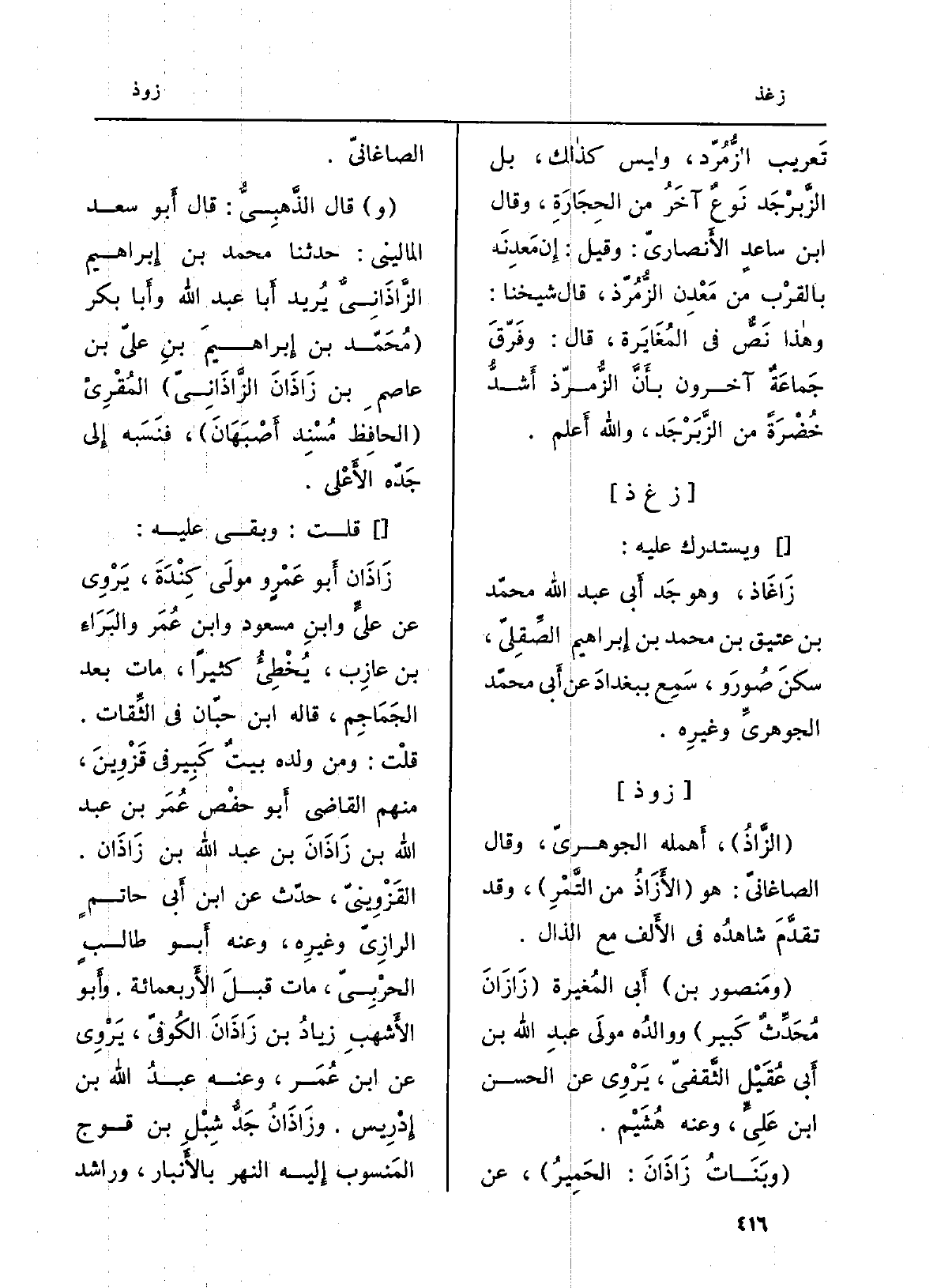 (و) قَالَ الذَّهبِيّ: قَالَ أَبو سعد الْمَالِينِي: حَدثنَا مُحَمَّد بن إِبراهيم} - الزًّاذَانيُّ يُريد أَبا عبد الله وأَبا بكر (مُحَمّد بن إِبراهيمَ بنِ عليّ بن عاصمِ بن زَاذَانع {- الزَّاذَانِيّ) المُقْرِىء (الحافِظ مُسْنِد أَصْبَهَانَ) ، فنَسَبه إِلى جَدّه الأَعْلى.