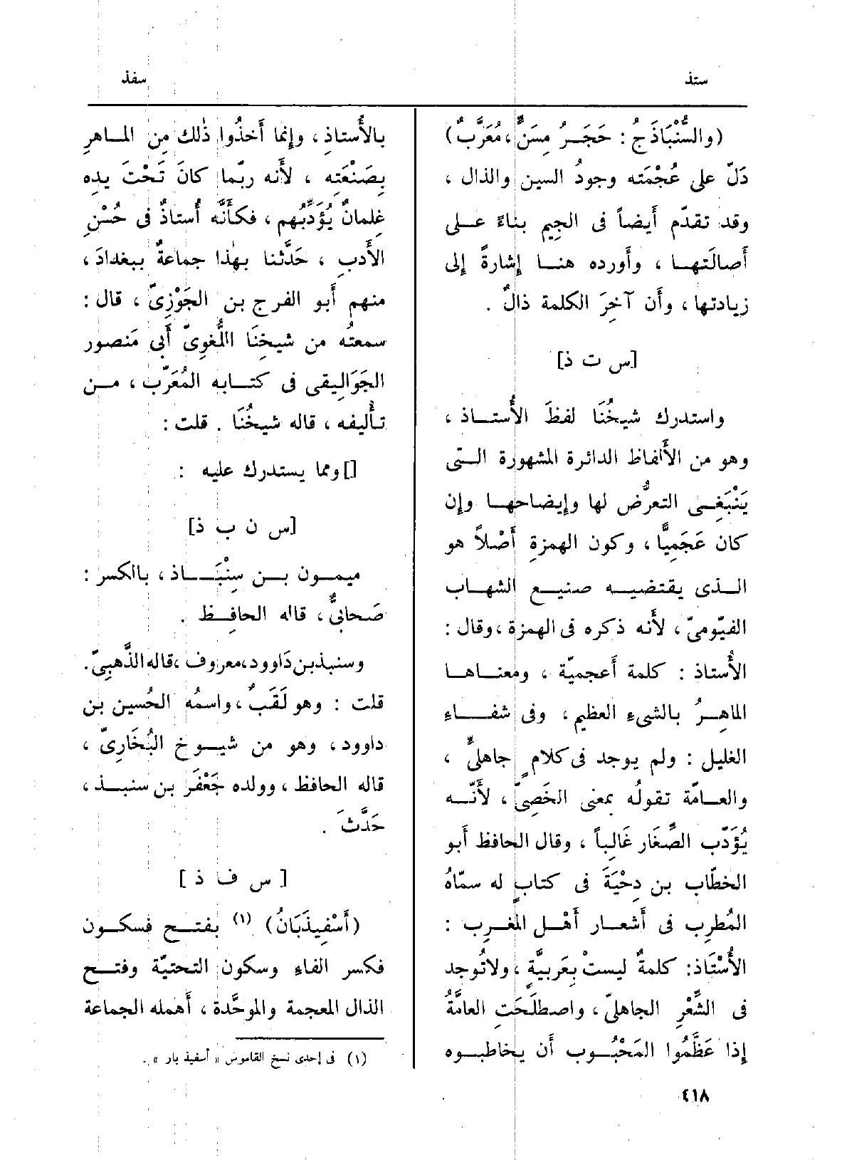 : واستدرك شيخُنَا لفظَ الأُستاذ، وَهُوَ من الأَلفاظ الدائرة الْمَشْهُورَة الَّتِي يَنْبَغِي التعرُّض لَهَا وإِيضاحها وإِن كَانَ عَجَمِيًّا، وَكَون الْهمزَة أَصْلاً هُوَ الَّذِي يَقْتَضِيهِ صَنِيع الشهَاب الفيُّوميّ، لأَنه ذكره فِي الْهمزَة، وَقَالَ: الأُستاذ: كلمة أَعجميّة، وَمَعْنَاهَا الماهِرُ بالشيءِ الْعَظِيم، وَفِي شفاءِ الغليل: وَلم يُوجد فِي كلامغ جاهليَ، والعامّة تقولُه بِمَعْنى الخَصِيّ، لأَنّه يُؤَدّب الصِّغَار غَالِباً، وَقَالَ الْحَافِظ أَبو الخطّاب بن دِحْيَةَ فِي كتابٍ لَهُ سمّاهُ المُطرِب فِي أَشعار أَهْل المغرِب: الأُسْتَاذ: كلمةٌ ليستْ بِعَربيَّةٍ، وَلَا تُوجد فِي الشِّعْرِ الجاهليّ، واصطلَحَتِ العامَّةُ إِذا عَظَّمُوا المَحْبُوب أَن يخاطبوه بالأُستاذِ، وإِنما أَخذُوا ذالك مِن الماهرِ بِصَنْعَتِه، لأَنه ربّما كانَ تَحْتَ يدِه غِلمانٌ يُؤَدِّبهم، فكأَنَّه أُستاذٌ فِي حُسْنِ الأَدبِ، حَدَّثنا بهشذا جماعةٌ ببغدادَ، مِنْهُم أَبو الْفرج بن الجَوْزِيّ، قَالَ: سمعتُه من شيخِنَا اللُّغوِيّ أَبي مَنصور الجَوَالِيقي فِي كِتَابه المُعَرّب، من تأْليفه، قَالَه شيخُنَا. قلت: