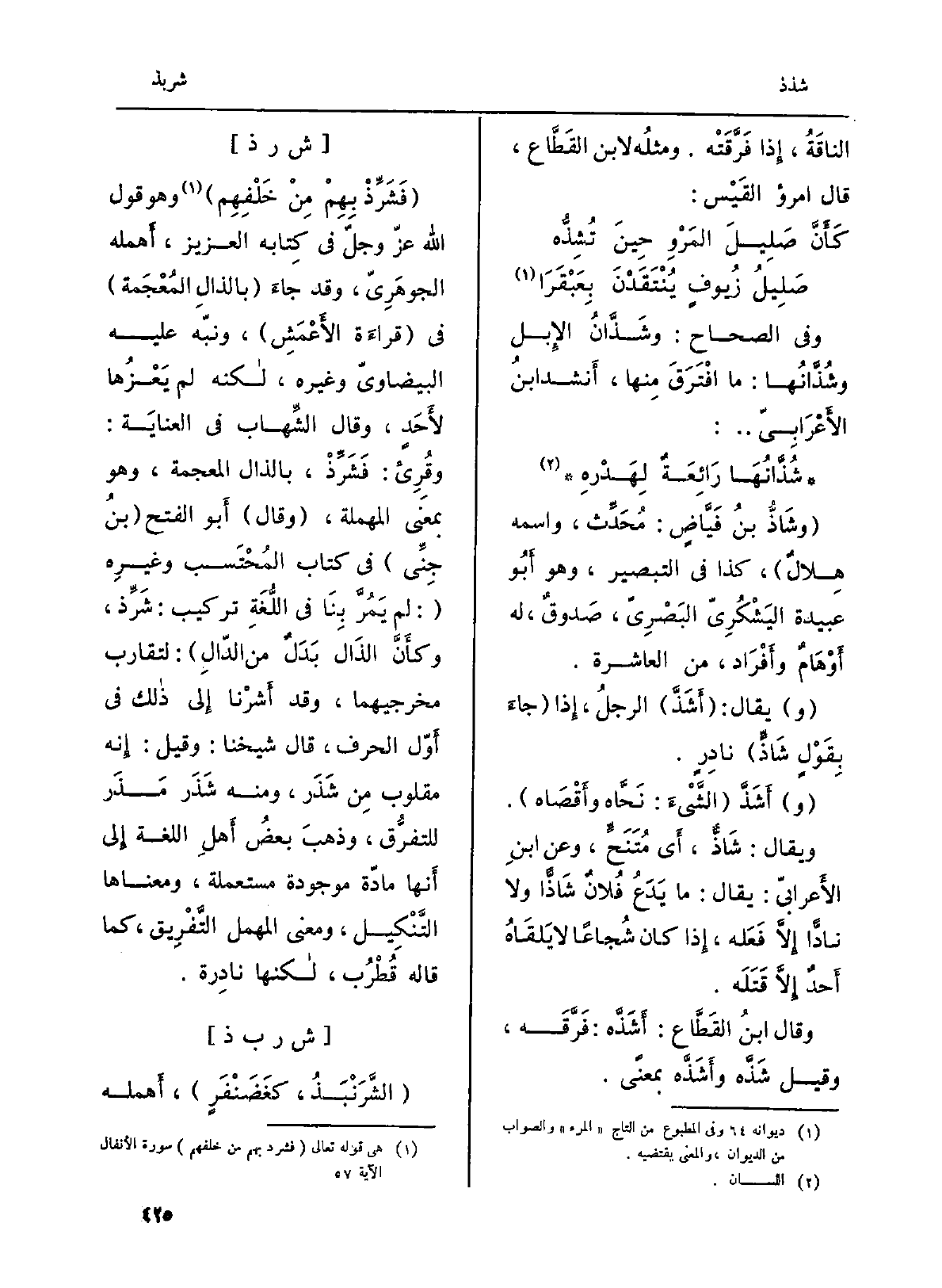 : (فَشَرِّذْ بِهِمْ مِنْ خَلْفِهِم) وَهُوَ قَول الله عزّ وجلّ فِي كِتابه الْعَزِيز، أَهمله الجوهَرِيّ، وَقد جاءَ (بِالذَّالِ المُعْجَمة) فِي (قراءَة الأَعْمَشِ) ، ونبّه عَلَيْهِ البيضاويّ وَغَيره، لاكنه لم يَعْزُها لأَحَدٍ، وَقَالَ الشِّهاب فِي العنايَة: وقُرِىء: فَشَرِّذْ، بِالذَّالِ الْمُعْجَمَة، وَهُوَ بِمَعْنى الْمُهْملَة، (وَقَالَ) أَبو الْفَتْح (بنُ جِنِّي) فِي كتاب المُحْتَسب وغيرِه (: لم يَمُرَّ بِنَا فِي اللُّغَةِ تركيب: شَرِّذ، وكأَنَّ الذَال بَدَلٌ من الدّالِ) : لتقارب مخرجيهما، وَقد أَشرْنا إِلى ذالك فِي أَوّل الْحَرْف، قَالَ شَيخنَا: وَقيل: إِنه مقلوب مِن شَذَر، وَمِنْه شَذَرَ مَذَر للتفرُّق، وذهبَ بعضُ أَهلِ اللُّغَة إِلى أَنها مادّة مَوْجُودَة مستعملة، وَمَعْنَاهَا التَّنْكِيل، وَمعنى المهمل التَّفْرِيق، كَمَا قَالَه قُطْرُب، لاكنها نادِرة.