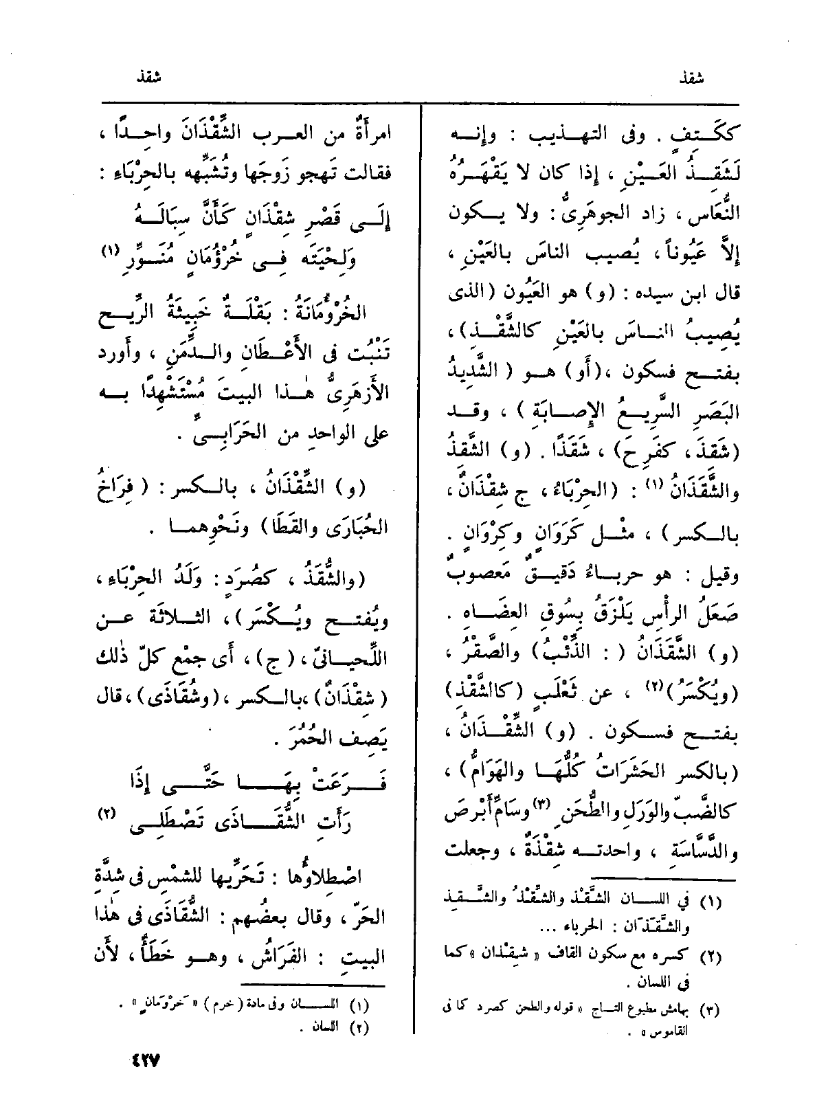 ككَتِفٍ. وَفِي التَّهْذِيب: وإِنه لَشَقِذُ العَيْنِ، إِذا كَانَ لَا يَقْهَرُهُ النّعَاس، زَاد الجوهَرِيُّ: وَلَا يكون إِلاَّ عَيُوناً، يُصيب الناسَ بالعَيْنِ، قَالَ ابْن سَيّده: (و) هُوَ العَيُون (الَّذِي يُصِيبُ الناسَ بالعَيْنه كالشَّقْذِ) ، بِفَتْح فَسُكُون، (أَو) هُوَ (الشَّدِيدُ البَصَرِ السَّرِيعُ الإِصابَةِ) ، وَقد (شَقِذَ، كفَرِحَ) ، شَقَذاً. (و) الشَّقِذُ والشَّقَذَانُ: (الحِرْبَاءُ، ج شِقْذَانٌ، بِالْكَسْرِ) ، مثْل كَرَوَانٍ وكِرْوَانٍ. وَقيل: هُوَ حرباءُ دَقيقٌ مَعصوبٌ صَعَلُ الرأْسِ يَلْزَقُ بِسُوقِ العِضَاهِ. (و) الشَّقَذَانُ (: الذِّئْبُ) والصَّقْرُ، (ويُكْسَرُ) ، عَن ثَعْلَبٍ (كالشِّقْذِ) بِفَتْح فَسُكُون. (و) الشِّقْذَانُ، (بِالْكَسْرِ الحَشَرَاتُ كُلُّهَا والهَوَامُّ) ، كالضَّبّ والوَرَلِ والطُّحَنِ وسَامَ أَبْرصَ والدَّسَّاسَةِ، واحدته شِقْذَةٌ، وَجعلت امرأَةٌ من الْعَرَب الشِّقْذَانَ واحِداً، فَقَالَت تَهجو زَوجَها وتُشَبِّهه بالحِرْبَاءِ: