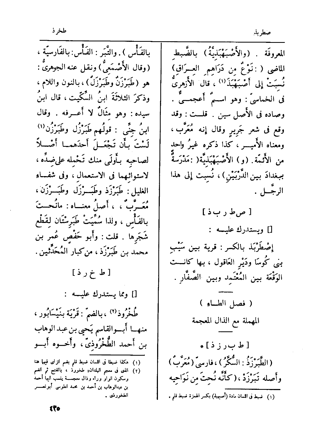المعروفَة. (الأَصْبَهْبَذِيَّةُ) بالضَّبطِ الْمَاضِي (: نَوْعٌ مِن دَرَاهِمِ العِرَاقِ) نُسِبَتْ إِلى أَصْبَهْبَذَ، قَالَ الأَزهريُّ فِي الخماسيّ: وَهُوَ اسمٌ أَعجميٌّ. وصاده فِي الأَصل سين. قلت: وَقد وَقع فِي شعر جَرِيرٍ وَقَالَ إِنه مُعَرَّب، وَمَعْنَاهُ الأَمير، كَذَا ذكره غيرُ واحدٍ من الأَئمّة. (و) الأَصْبَهْبَذِيصة (: مَدْرَسةٌ ببغدادَ بَين الدَّرْبَيْنِ) ، نُسِبت إِلى هَذَا الرجَّل.