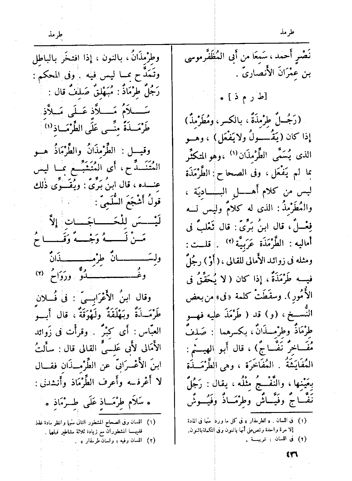 : (رَجُلٌ طِرْمِذَةٌ، بِالْكَسْرِ، ومُطَرْمِذٌ) إِذا كَانَ (يَقُولُ وَلَا يَفْعَل) ، وَهُوَ الَّذِي يُسَمَّى الطِّرْمِذَان، وَهُوَ المتكثِّر بِمَا لم يَفْعَل، وَفِي الصِّحَاح: الطَّرْمَذَة لَيْسَ من كَلَام أَهلِ البادِيَة، والمُطَرْمِذُ: الَّذِي لَهُ كلامٌ وَلَيْسَ لَهُ فِعْلٌ، قَالَ ابنُ بَرِّيّ: قَالَ ثَعْلبٌ فِي أَماليه: الطَّرْمَذَة عَرَبِيَّة. قلت: وَمثله فِي زَوَائِد الأَمالي للقالي، (أَوْ) رجُلٌ فِيهِ طَرْمَذَةٌ، إِذا كَانَ (لَا يُحَقِّقُ فِي الأُمور) . وسقَطَتْ كلمة (فِي) من بعض النُّسخ، (و) قد (طَرْمَذَ عَلَيْهِ فَهُوَ طِرْمَاذٌ وطِرْمَذَانٌ، بكسرهما: صَلِفٌ مُفَاخِرٌ نَفَّاجٌ) ، قَالَ أَبو الْهَيْثَم: المُفَايَشَةُ. المُفَاخَرَة، وَهِي الطَّرْمَذَة بِعَيْنِها، والنَّفْجُ مِثْلُه، يُقَال: رَجُلٌ نَفَّاجٌ وفَيَّاشٌ وطِرْمَاذٌ وفَيُوشٌ وطِرْمِذَانُ، بالنُّون، إِذا افتخَرع بالباطِل وتَمَدَّح بِمَا لَيْسَ فِيهِ. وَفِي الْمُحكم: رَجُلٌ طِرْمَاذٌ: مُبَهْلِقٌ صَلِفٌ قَالَ: