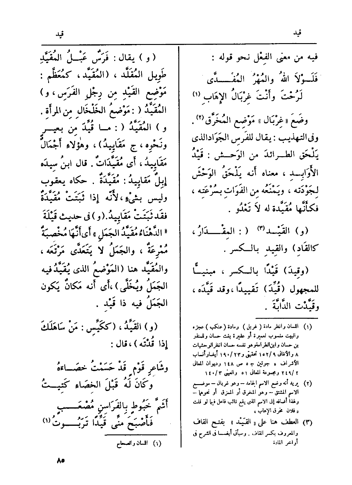 (و) يُقَال: فَرَسٌ عَبْلُ {المُقَيَّدِ طَوهيل المُقَلَّد، (المُقَيَّد، كمُعَظَّم: مَوْضِع القَيْدِ مِن رِجْلِ الفَرَسِ، و) المُقَيَّدُ (: مَوْضِعُ الخَلْخَالِ مِن المرأَةِ. و) المُقَيَّدُ (: مَا} قُيِّدَ مِن بعيرٍ ونَحْوِ، ج {مَقَايِيدُ) ، وهاؤلاءِ أَجْمَالٌ مَقَايِيدُ، أَي} مُقَيَّدَاتٌ. قَالَ ابنُ سِيدَه إِبِلٌ {مَقايِيدُ:} مُقَيَّدَةٌ. حَكَاهُ يَعْقُوب وَلَيْسَ بشيْءٍ، لأَنّه إِذا ثَبَتَتْ {مُقَيَّدَةٌ فقَد ثَبَتَتْ مَقَايِيدُ. (و) فِي حَدِيث قَيْلَةَ (الدَّهْنَاءُ} مُقَيَّدُ الجَمَلِ) أَي أَنَّهَا مُخْصِبَةٌ مُمْرِعَةٌ، والجَمَلُ لَا يَتَعَدَّى مَرْتَعِ، {والمُقَيَّد هُنَا (المَوْضعُ الَّذِي} يُقَيَّدُ فِيهِ الجَمَلُ ويُخَلَّى) ، أَي أَنه مَكانٌ يَكون الجَمَلُ فِيهِ ذَا قَيْد.