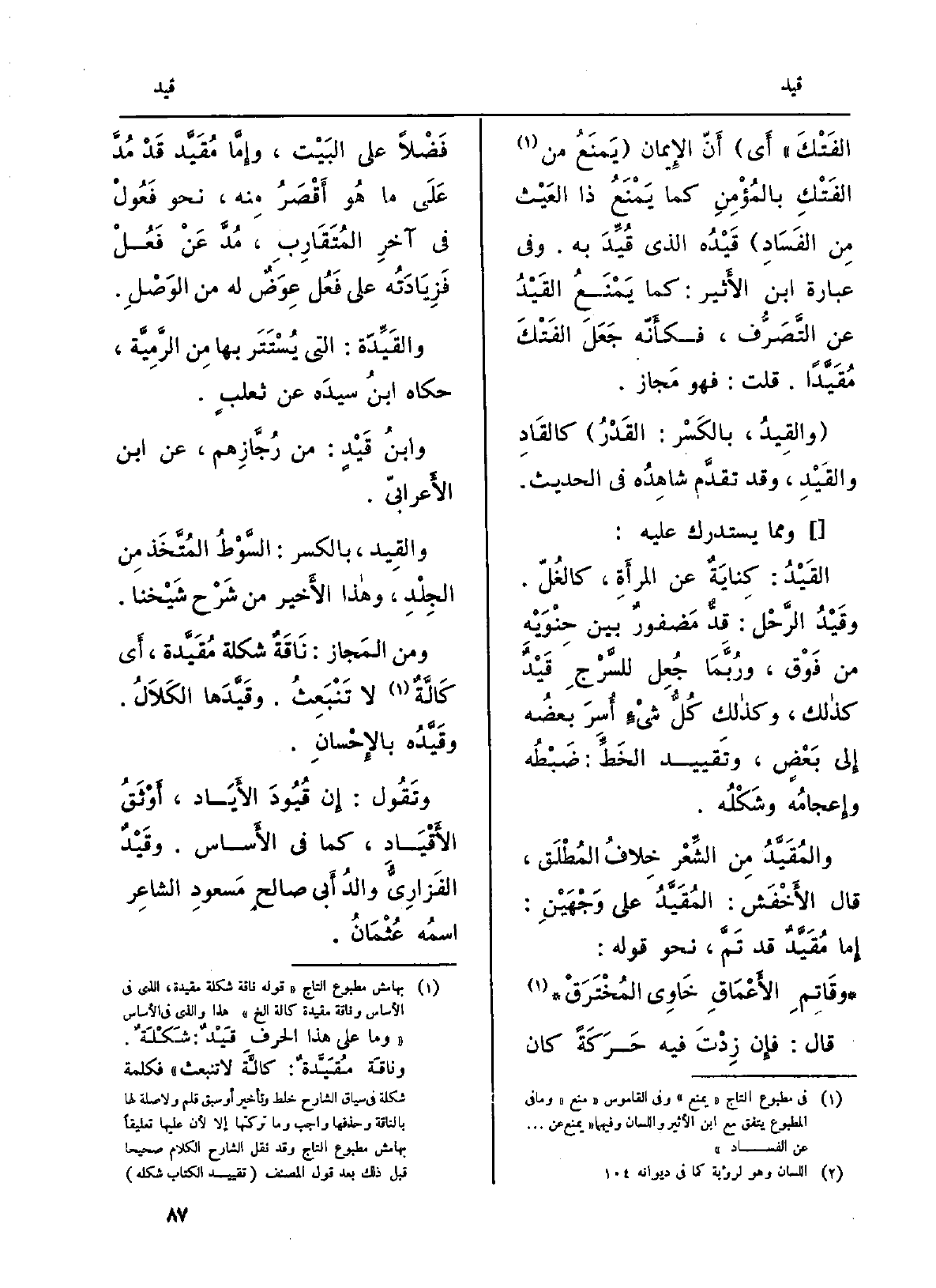 } القَيْدُ: كِنايَةٌ عَن المرايةِ، كالغُلّ. {وقَيْدُ الرَّحْل: قِدٌّ مَضفورٌ بَين حِنْوَيْهِ من فَوْق، ورُبَّمَا جُعِل للسَّرْجه قَيْدٌ كذالك، وكذالك كُلُّ شيْءٍ أُسِرَ بعضُه إِلَى بَعْضٍ،} وتَقييد الخَطِّ: ضَبْطُه وإِعجامُه وشَكْلُه.