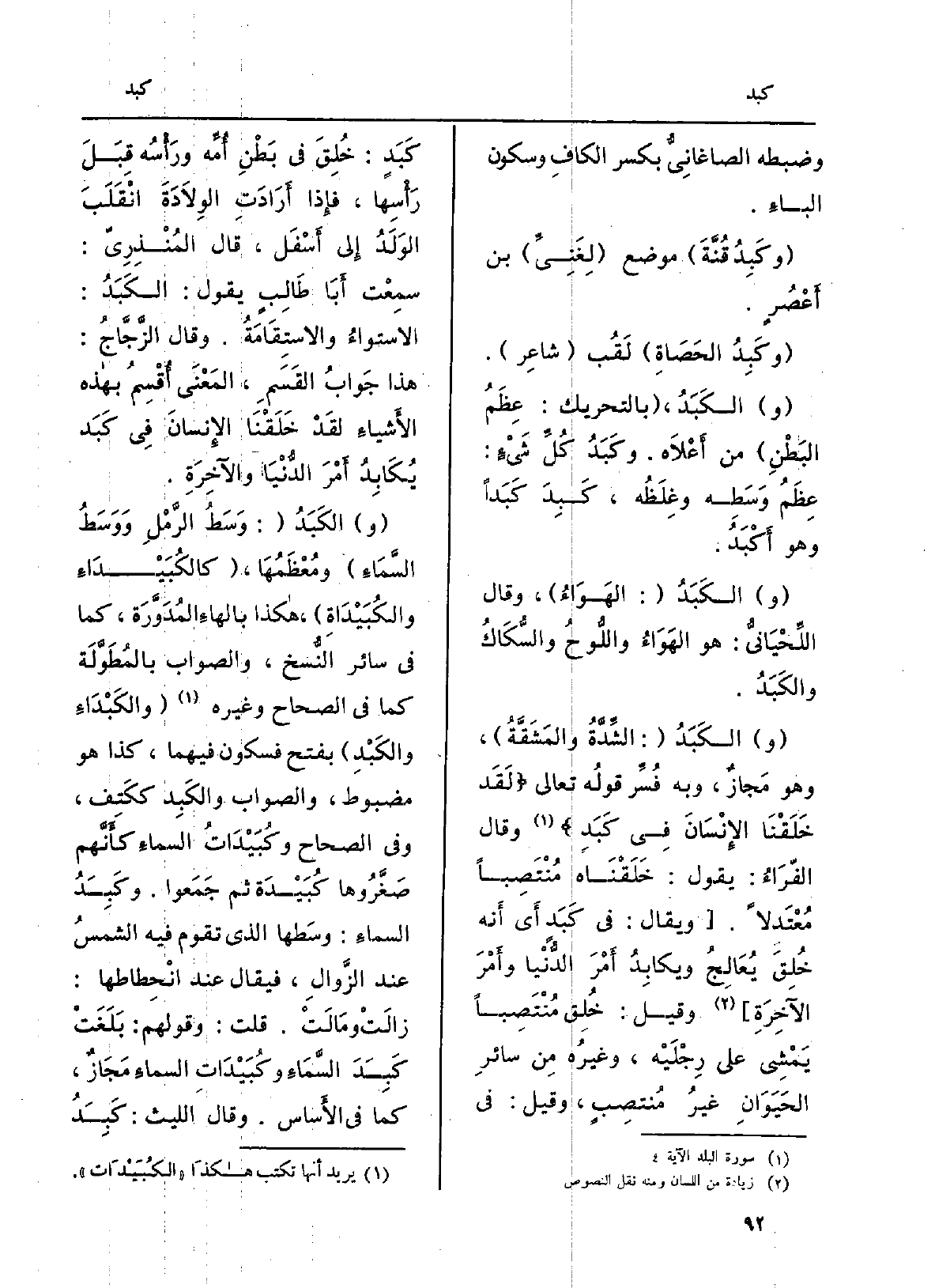 (و) الكَبَدُ (: الشِّدَّةُ والمَشَقَّةُ) ، وَهُوَ مَجازٌ، وَبِه فُسِّر قَوْله تَعَالَى: {لَقَدْ خَلَقْنَا الإِنسَانَ فِى كَبَدٍ} (سُورَة الْبَلَد، الْآيَة: 4) وَقَالَ الفرَاءُ: يَقُول: خَلَقْنَاه مُنْتَصِباً مُعْتَدلاً. (وَيُقَال: فِي كَبعدٍ أَي أَنه خُلِقَ يُعَالِجُ ويكابِدُ أَمْرَ الدُّنْيا وأَمْرَ الآخِرَةِ) وَقيل: خُلِق مُنْتَصِباً يَمحشِي على رِجْلَيْه، وغيرُه مِن سائرِ الحَيَوَانِ غيرُ مُنتصِبٍ، وَقيل: فِي كَبَدٍ: خُلِقَ فِي بَطْنِ أُمِّه ورَأْسُه قِبَلَ رَأْسِها، فإِذا أَرَادَتِ الوِلاَدَةَ انْقَلَبَ الوَلَدُ إِلى أَسْفَل، قَالَ المُنْذِرِيّ: سمِعْت أَبَا طَالِبٍ يَقُول: الكَبَدُ: الاستواءُ والاستِقَامَةُ. وَقَالَ الزَّجَّاجُ: هَذَا جَوابُ القَسَمِ، المَعْنَى أُقْسِمُ بهاذه الأَشياءِ لقَدْ خَلَقْنَا الإِنسانَ فِي كَبد يُكَابِدُ أَمْرَ الدُّنْيَا والآخِرَةِ.