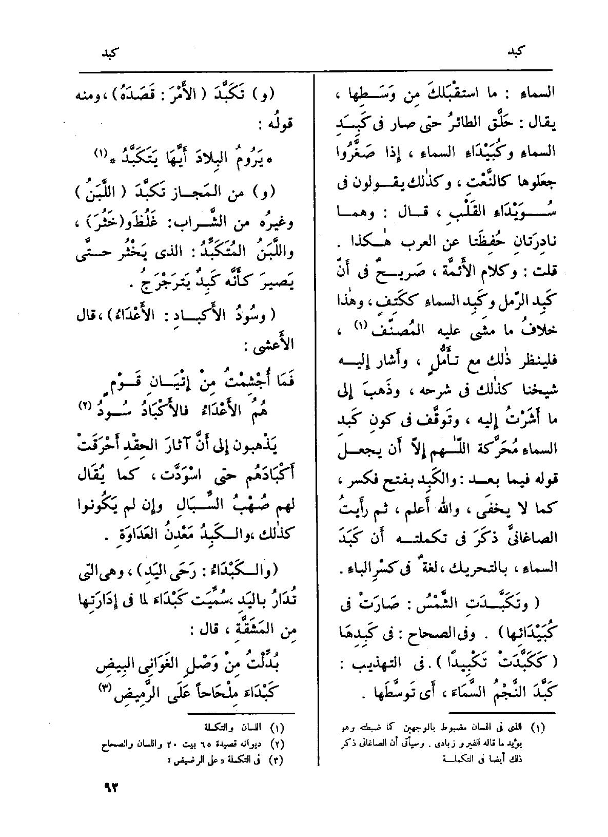 السماءِ: مَا استقْبَلكَ مِن وَسَطِها، يُقَال: حَلَّق الطائرُ حَتَّى صَار فِي كَبِدِ السماءِ وكُبَيْدَاءِ السماءِ، إِذا صَغَّرُوا جعَلوها كالنَّعْتِ، وكذالك يَقُولُونَ فِي سُوَيْدَاءِ القَلْبِ، قَالَ: وهما نادِرَتانِ حُفِظَتا عَن الْعَرَب هاكذا. قلت: وَكَلَام الأَئمَّة، صَريحٌ فِي أَنّ كَبِد الرّمل وكَبِد السماءِ ككَتِفٍ، وهاذا خلافُ مَا مشَى عَلَيْهِ المُصنّف، فَلْينْظر ذالك مَعَ تأْمُّلٍ، وأَشار إِليه شَيخنَا كذالك فِي شَرحه، وذَهبَ إِلى مَا أَشَرْتُ إِليه، وتَوقَّف فِي كونِ كَبدِ السماءِ مُحَرَّكة اللَّهُمَّ إِلاّ أَن يجعلع قَوْله فِيمَا بعد: والكَبِد بِفَتْح فَكسر، كَمَا لَا يخفَى، وَالله أَعلم، ثمَّ رأَيتُ الصاغانيَّ ذكَرَ فِي تكملته أَن كَبَدَ السماءِ، بِالتَّحْرِيكِ، لغةٌ فِي كسْرِ الباءِ.