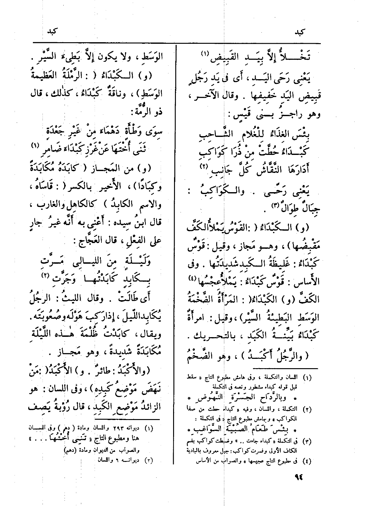 (و) الكَبْدَاءُ (: القَوْسُ يَمْلأُ الكَفَّ مَقْبِضُها) ، وَهُوَ مَجاز، وَقيل: قَوْسٌ كَبْدَاءُ: غَلِيظَةُ الكَبِدِ شَدِيدَتُها. وَفِي الأَساس: قَوْسٌ كَبْدَاءُ: يَمْلأُ عِجْسُها الكَفَّ (و) الكَبْدَاءُ (: المَرْأَةُ الضَّخْمَةُ الوَسَطُ البَطِيئةُ السَّيْر) ، وَقيل: امرأَةٌ كَبْدَاءُ بَيِّنةُ الكَبَدِ، بِالتَّحْرِيكِ.