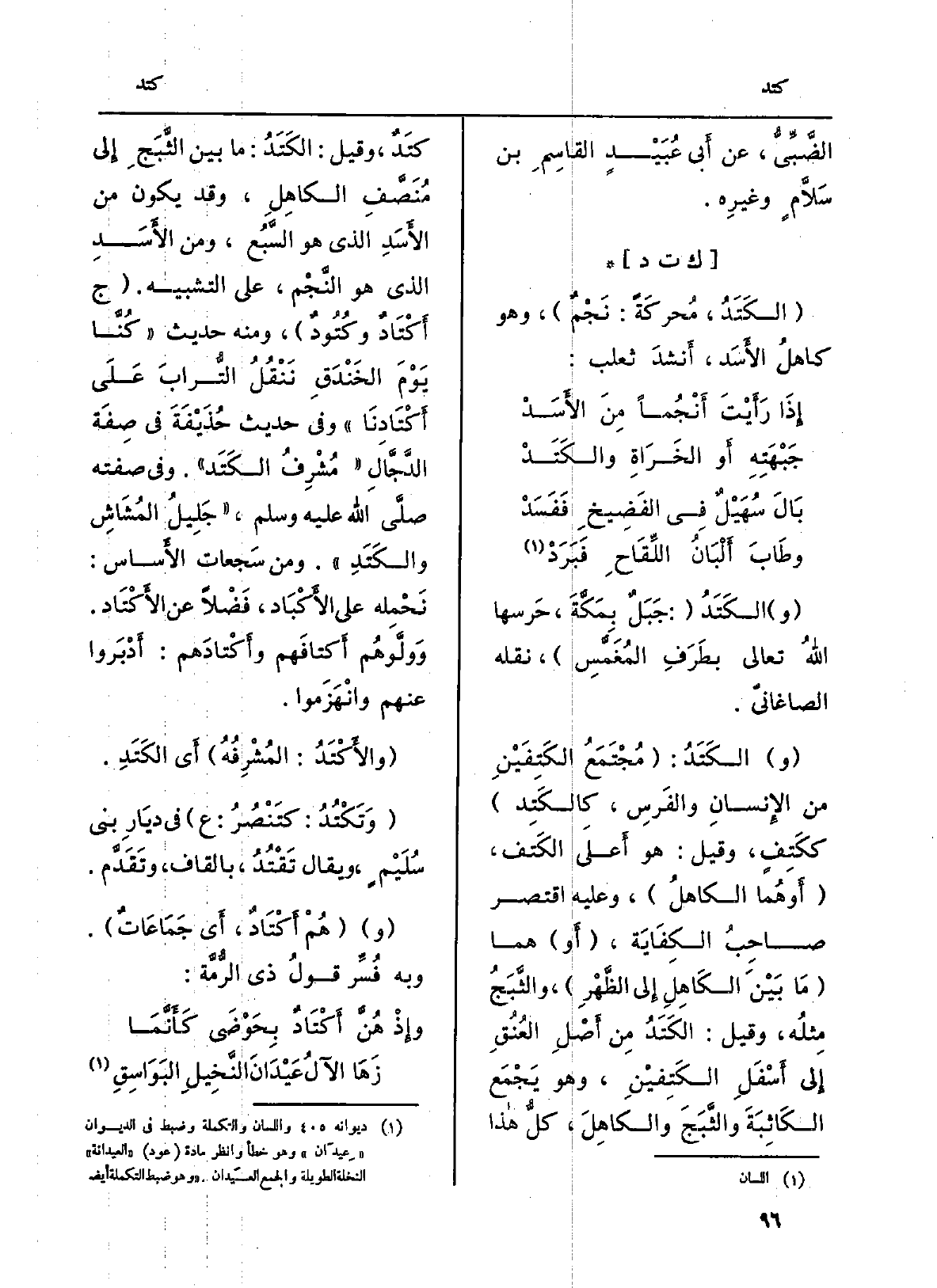 (و) الكَتَدُ: (مُجْتَمَعُ الكَتِفَيْنِ من الإِنسانِ والفَرسِ، كالكَتِد) ككَتِفٍ، وَقيل: هُوَ أَعلى الكَتف، (أَوهُما الكاهلُ) ، وَعَلِيهِ اقْتصر صاحِبُ الكِفَايَة، (أَو) هما (مَا بَيْنَ الكَاهِلِ إِلى الظَّهْرِ) ، والثَّبَجُ مِثلُه، وَقيل: الكَتَدُ مِن أَصْلِ العُنُقِ إِلى أَسْفَلِ الكَتِفيْنِ، وَهُوَ يَجْمَع الكَاثِبَةَ والثَّبَجَ والكاهِلَ، كلُّ هاذا كتَدٌ، وَقيل: الكَتَدُ: مَا بَين الثَّبَجِ إِلى مُنَصَّفِ الكاهِلِ، وَقد يكون من الأَسَدِ الَّذِي فَهُوَ السَّبُع، وَمن الأَسَدِ الَّذِي هُوَ النَّجْم، على التَّشْبِيه (ج أَكْتَادٌ وكُتُودٌ) ، وَمِنْه حَدِيث (كُنَّا يَوْمَ الخَنْدَقِ نَنْقُلُ التُّرابَ عَلَى أَكْتَادِنَا) وَفِي حَدِيث حُذَيْفَةَ فِي صِفَة الدَّجَّالِ (مُشْرِفُ الكَتَدَ) . وَفِي صفته صلى الله عَلَيْهِ وَسلم (جَلِيلُ المُشَاشِ والكَتَدِ) . وَمن سَجعات الأَساس: نَحْمِله على الأَكْبَاد، فَضْلاً عَن الأَكْتَاد. وَولَّوهُم أَكتافَهم وأَكْتادَهم: أَدْبَروا عَنْهُم وانْهَزَموا.