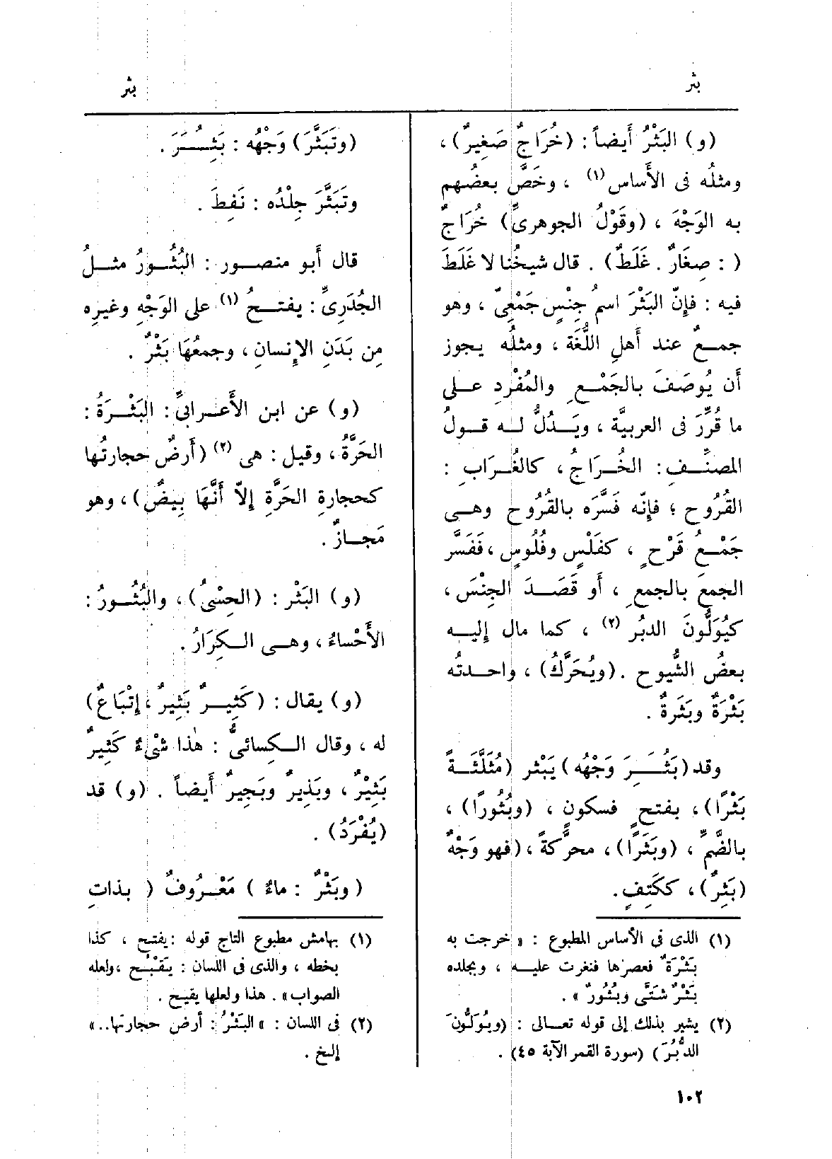 (و) البَثْرُ أَيضاً: (خُرَاجٌ صَغِيرٌ) ، ومثلُه فِي الأَساس، وخَصَّ بعضُهم بِهِ الوَجْهَ، (وقَوْلُ الجوهريِّ) خُرَاجٌ: (صِغَارٌ غَلَطٌ) . قَالَ لشيخُنا لَا غَلَطَ فِيهِ: فإِنّ البَثْرَ اسمُ جِنْسٍ جَمْعِيّ، وَهُوَ جمعٌ عِنْد أَهلِ اللّغَة، ومثلُه يجوز أَن يُوصَفَ بالجَمعِ والمُفْردِ على مَا قرِّرَ فِي العربيَّة، ويَدُلُّ لَهُ قولُ المصنِّفِ: الخُرَاجُ، كالغُرَابِ: القُروح؛ فإِنّه فَسَّرَه بالقُرُوح وَهِي جَمْعُ قَرْحٍ، كفَلْسٍ وفُلُوسٍ، فَفَسَّر الجمعَ بالجمعِ، أَو قَصَدَ الجِنْسَ، كيُوَلُّونَ الدبُر، كَمَا مَال إِليه بعضُ الشُّيوخ. (ويُحَرَّكُ) ، واحدتُه بَثْرَةٌ وبَثَرةٌ.