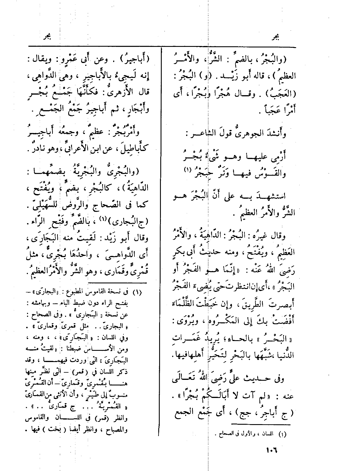 وَفِي حَدِيث عليَ رَضِيَ اللهُ تَعَالَى عَنهُ: (لم آتٍ لَا أَبَالَكَمُ بُجْراً) . (ج أَباجِرُ، جج) ، أَي جَمْع الْجمع (أَباجيرُ) . وَعَن أَبي عَمْرٍ و: وَيُقَال: إِنه لَيجِيءُ بالأَباجِيرِ، وَهِي الدَّواهِي، قَالَ الأَزهريُّ: فكأَنَّهَا جَمعُ بُجْرٍ وأَبْجَارٍ، ثمَّ أَباجِيرُ جَمْعُ الجَمْعِ.