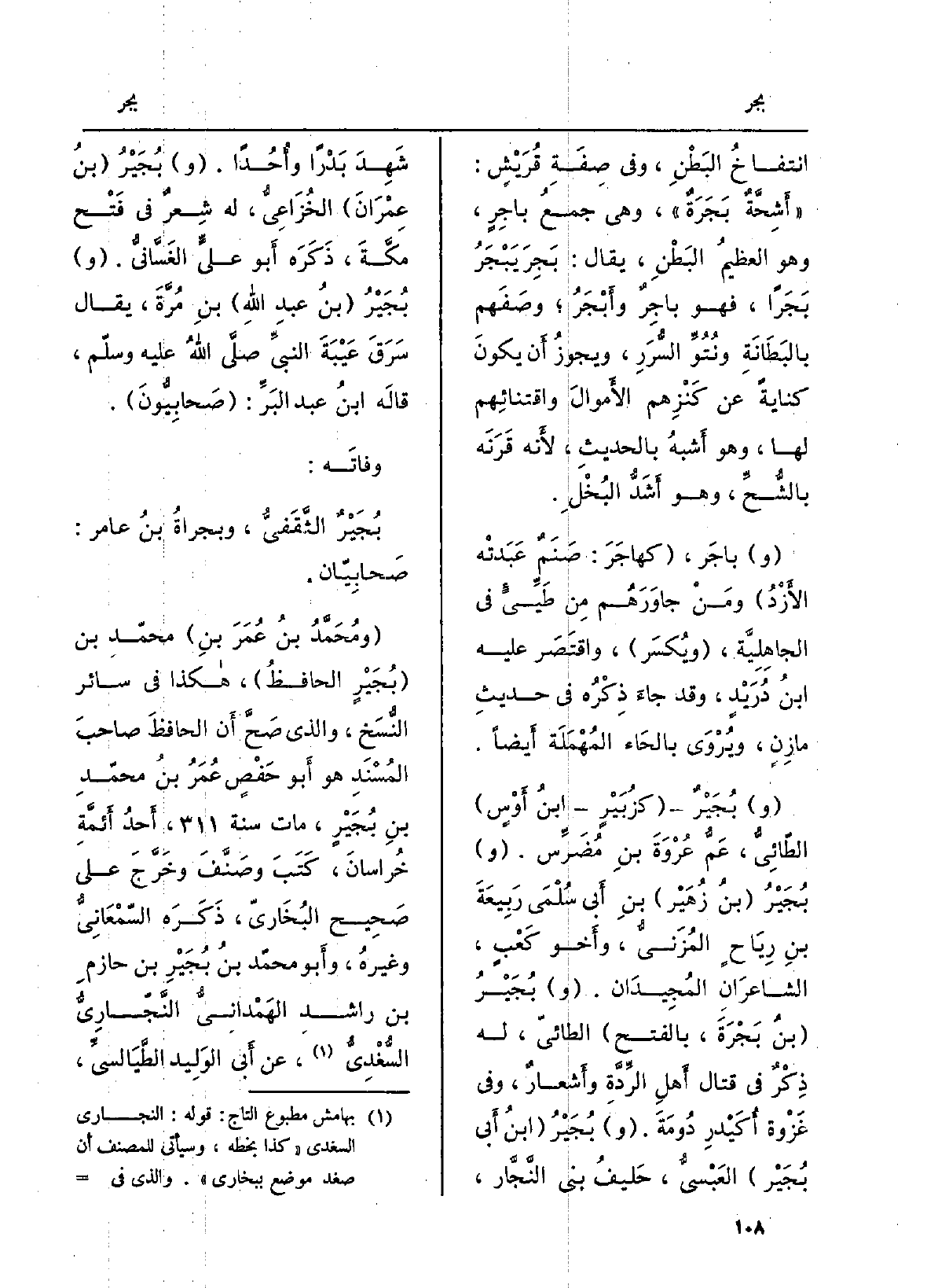 (و) باجَر، (كهاجَرَ: صَنَمٌ عَبَدتْه الأَزْدُ) ومَنْ جاوَرَهُم مِن طَيِّىءٍ فِي الجاهِلِيَّة، (ويُكسَر) ، واقتَصَ عَلَيْهِ ابنُ دُرَيْدٍ، وَقد جاءَ ذِكْرُه فِي حديثِ مازِنٍ، ويُرْوَى بالحَاء المُهْمَلَة أَيضاً (و) بُجَيْرٌ (كزُبَيْرٍ ابنُ أَوْسٍ) الطّائِيُّ، عَمُّ عُرْوَةَ بنِ مُضَرِّس. (و) بُجَيْرُ (بنُ زُهَيْر) بنِ أَبي سُلْمَى رَبِيعَةَ بنِ رِيَاحٍ المُزَنيُّ، وأَخو كَعْبٍ، الشاعرَانِ المُجِيدَان. (و) بُجَيْرُ (بنُ بَجْرَةَ، بِالْفَتْح) الطائيّ، لَهُ ذِكْرٌ فِي قتال أَهلِ الرِّدَّةِ وأَشعارٌ، وَفِي غَزْوة أُكَيْدرِ دُومَةَ. (و) بُجَيْرُ (ابنُ أَبي بُجَيْر) العَبْسيُّ، حَليفُ بني النَّجَّار، شَهِدَ بَدْراً وأُحُداً. (و) بُجَيْرُ (بنُ عمْرَانَ) الخُزَاعِيُّ، لَهُ شِعرٌ فِي فَتْح مكَّةَ، ذَكَرَه أَبو عليَ الغَسَّانيُّ. (و) بُجَيْرُ (بنُ عبدِ اللهِ) بنِ مرَّةَ، يُقَال سَرَقَ عَيْبَةَ النبيِّ صلَّى اللهُ عليْه وسلّم، قالَه ابنُ عبد البَرِّ: (صَحابِيُّونَ) .