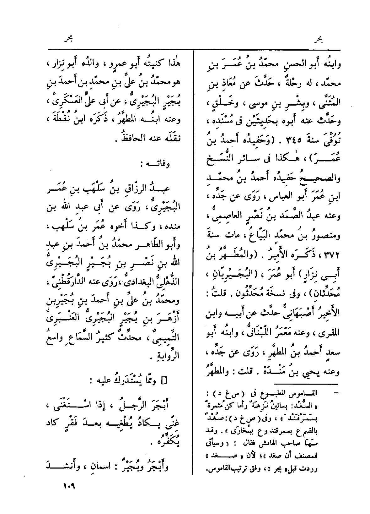 وابنُه أَبو الحسنِ محمّدُ بنُ عُمَرَ بنِ محمّد، لَهُ رحْلةٌ، حَدَّثَ عَن مُعَاذِ بنِ المُثَنَّى، وبِشْرِ بنِ مُوسَى، وخَلْقٍ، وحَدَّث عَنهُ أَبوهُ بحَدِيثَيْن فِي مُسْنَدِه، تُوُفِّيَ سنةَ 345 هـ. (وَحَفِيدُه أَحمدُ بنُ عُمَرَ) ، هاكذا فِي سَائِر النُّسَخ والصحيحُ حَفِيدُه أَحمدُ بنُ محمّدِ بنِ عُمَرَ أَبو الْعَبَّاس، رَوَى عَن جَدِّه، وَعنهُ عبدُ الصَّمَد بنُ نَصْرٍ العاصِمِيُّ، ومنصورُ بنُ محمّدٍ البَيّاعُ، مَاتَ سنةَ 372 هـ، ذَكَرَه لأَمِيرُ. (والمُطَهَّرُ بنُ أَبِي نِزَارٍ) أَبو عُمَرَ، (البُجَيْرِيّانِ، مُحَدِّثانِ) ، وَفِي نسخَة مُحَدِّثُون. قلتُ: الأَخِيرُ أَصْبَهَانِيٌّ حدَّث عَن أَبيه وَابْن الْمقري، وَعنهُ مَعْمَرُ اللّبْنَانيُّ، وابنُه أَبو سعدٍ أَحمدُ بنُ المطهَّرِ، رَوَى عَن جَدِّه، عَنهُ يحيى بنُ مَنْدَهْ. قلت: والمطهَّرُ هاذا كنيتُه أَبُو عمرٍ و، والدُه أَبو نِزار، هُوَ محمّدُ بنُ عليِّ بنِ محمدِ بن أَحمدَ بنِ بُجَيْرٍ البُجَيْرِيُّ، عَن أَبي عليَ العَسْكَرِيِّ، وَعنهُ ابنُه المطهَّرُ، ذكرَه ابنُ نُقْطَةَ، نقَلَه عَنهُ الحافظُ.