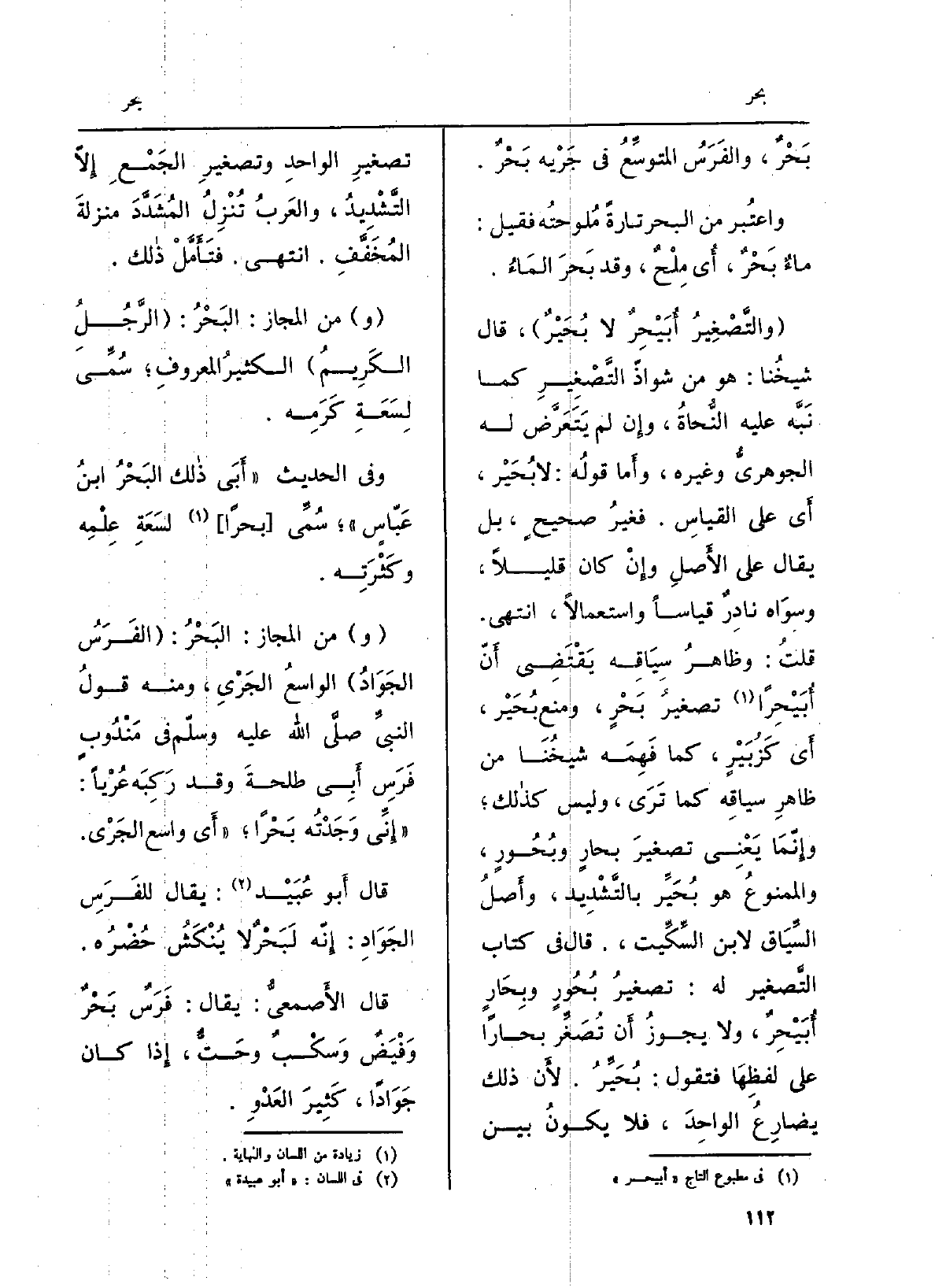 (والتَّصْغِيرُ أُبَيْحِرٌ لَا بُحَيْرٌ) ، قَالَ شيخُنا: هُوَ من شواذّ التَّصّغِيرِ كَمَا نَبَّه عَلَيْهِ النُّحاةُ، وإِن لم يَتَعَرَّض لَهُ الجوهريُّ وَغَيره، وأَما قولُه: لَا بُحَيْر، أَي على القياسِ. فغيرُ صحيحٍ، بل يُقَال على الأَصلِ وإِنْ كَانَ قَلِيلا، وسوَاه نادِرٌ قِيَاسا واستعمالاً، انْتهى. قلتُ: وظاهرُ سِيَاقِه يَقْتَضِي أَنْ أُبَيْحِراً تصغيرُ بَحْرٍ، وَمنع بُحَيْر، أَي كَزُبَيْرٍ، كَمَا فَهِمَه شيخُنَا من ظاهرِ سياقِه كَمَا تَرَى، وَلَيْسَ كذالك؛ وإِنّمَا يَعْنِي تصغيرَ بحارٍ وبُحُورٍ، والممنوعُ هُوَ بُحَيِّر بالتَّشْدِيد، وأَصلُ السِّيَاق لِابْنِ السِّكِّيت، قَالَ فِي كتاب التضغير لَهُ: تصغيرُ بُحُورٍ وبِحَارٍ أُبَيْحِرٌ، وَلَا يجوزُ أَن تُصَغِّر بحاراً على لفظِهَا فَتَقول: بُحَيِّرُ. لأَن ذَلِك يضارِعُ الواحِدَ، فَلَا يكونُ بَين تَصْغِير الواحدِ وتصغيرِ الجَمْعِ إِلّا التَّشْدِيدُ، والعَربُ تُنْزِلُ المُشَدَّدَ منزلةَ المُخَّفَفِ. انْتهى. فتَأَمَّلْ ذالك.