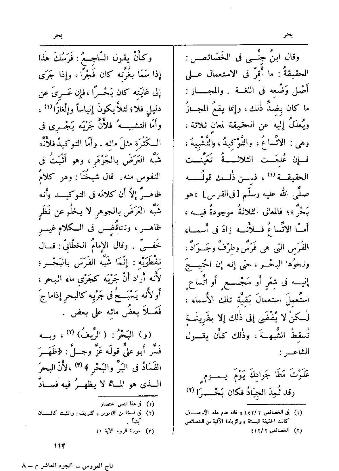 وَقَالَ ابنُ جِنِّي فِي الخَصَائص: الحقيقةُ: مَا أُقِرّ فِي الِاسْتِعْمَال على أَصْل وَضْعِه فِي اللُّغَة. وَالْمجَاز: مَا كَانَ بِضِدِّ ذالك، وإِنما يقعُ المجازُ ويُعدَلُ إِليه عَن الْحَقِيقَة لمعانٍ ثَلَاثَة، وَهِي: الاتِّساعُ، والتَّوْكِيدُ، والتَّشْبِيهُ، فإِن عُدِمَت الثلاثةُ تَعَيَّنت الحيقة، فمِن ذالك قولُه صلَّى الله عليْه وسلّم (فِي الْفرس) (هُوَ بَحْرٌ) ؛ فالمعاني الثلاثةُ موجودةٌ فِيهِ، أَمّا الاتِّساعُ لأَنه زادَ فِي أَسماءِ الفَرَسِ الَّتِي هِيَ فَرَسٌ وطِرْفٌ وجَوَادٌ، ونحوُها البحْر، حَتَّى إِنه إِن احْتِيجَ إِليه فِي شِعْرٍ أَو سَجْعٍ أَو اتِّساعٍ استُعمِلَ استعمالَ بَقِيَّةِ تِلْكَ الأَسماءِ، لاكنْ لَا يُفْضَى إِلى ذالك إِلا بقَرِينَةٍ تُسقِطُ الشُّبهةَ، وذالك كأَن يَقُول الشَّاعِر: