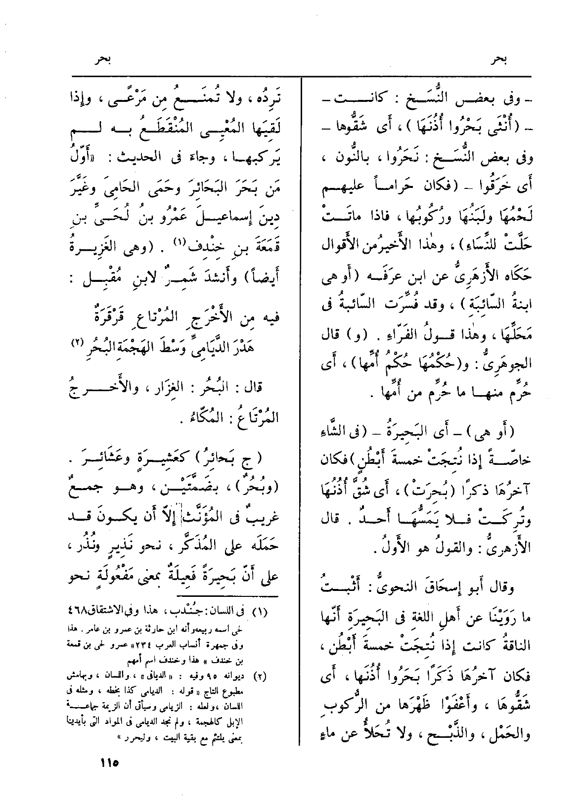 وَقَالَ أَبو إِسحَاقَ النحويُّ: أَثْبتُ مَا رَوَيْنَا عَن أَهلِ اللغةِ فِي البَحِيرَةِ أَنّها الناقةُ كَانَت إِذا نُتِجَتْ خمسةَ أَبْطُن، فَكَانَ آخرُهَا ذَكَراً بَحَرُوا أُذُنَها، أَي شَقُّوهَا، وأَعْفَوْا ظَهْرَها من الرُّكوبِ والحَمْل، والذَّبْح، وَلَا تُحَلأُ عَن ماءٍ نَرِدُه، وَلَا تُمنَعُ مِن مَرْعًى، وإِذا لَقِيَها المُعْيِى المُنْقَطَعُ بِهِ لم يَركبها، وجاءَ فِي الحَدِيث: (أَوّلُ مَن بَحَرَ البَحَائِرَ وحَمَى الحَامِيَ وغَيَّرَ دِينَ إِسماعيلَ عَمْرُو بنُ لُحَيِّ بنِ قَمةَ بنِ خِنْدِف. (وَهِي الغَزِيرةُ أَيضاً) وأَنشدَ شَمِرٌ لابنِ مُقْبِل: