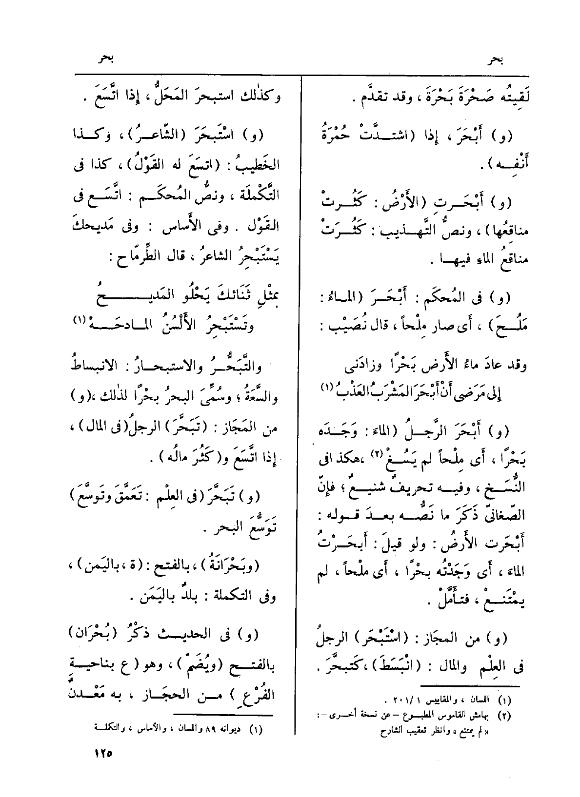 (و) من المجَاز: (اسْتَبْحَر) الرجلُ فِي العِلْم وَالْمَال: (انْبَسَطَ) ، كَتبحَّر وكذالك استبحرَ المَحَلّ، إِذا اتَّسَعَ.
