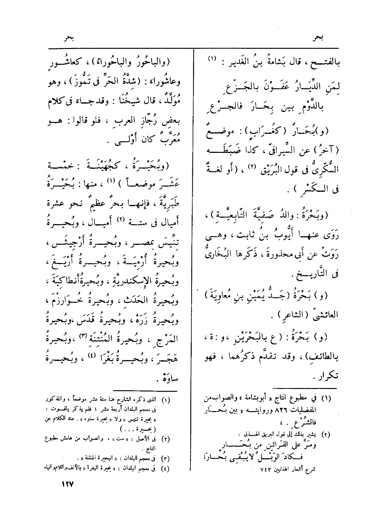 (و) بَحْرَةُ: (ع بالبَحْرَيْنِ، و: ة، بالطائفِ) ، وَقد تقدَّم ذكرُهما، فَهُوَ تكْرَار.
