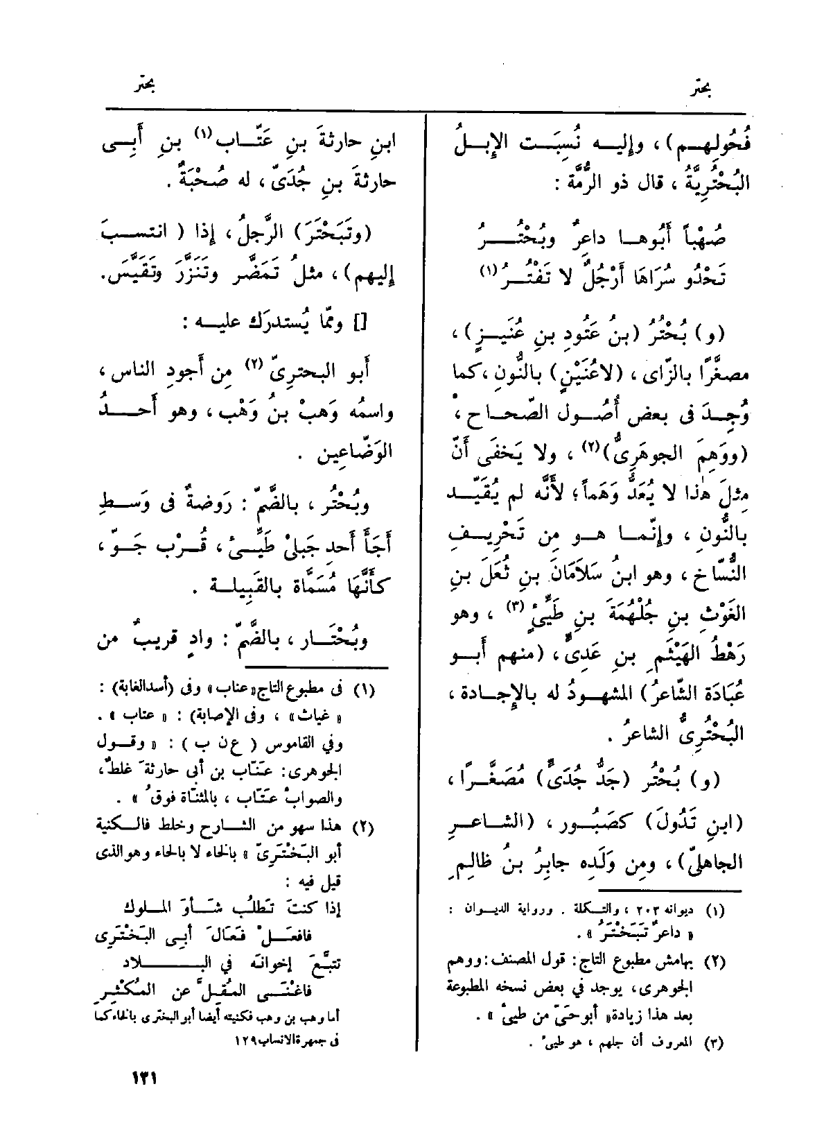 (و) بُحْتُرُ (بنُ عَتُودِ بنِ عُنَيزٍ) ، مصغَّراً بالزّاي، (لاعُنَيْنٍ) بالنُّونِ، كَمَا وُجِدَ فِي بعض أُصُول الصّحاح، (ووَهِمَ الجوهَرِيُّ) ، وَلَا يَخفَى أَنْ مِثلَ هاذا لَا يُعَدُّ وَهَماً؛ لأَنَّه لم يُقَيّد بالنُّونِ، وإِنّما هُوَ مِن تَحْرِيفِ النُّسّاخ، وهوابنُ سَلَامَانَ بنِ ثُعَلَ بنِ الغَوْثِ بنِ جُلْهُمَةَ بنِ طَيِّيءٍ، وَهُوَ رَهْطُ الهَيْثَمِ بنِ عَدِيَ، (مِنْهُم أَبو عُبَادَة الشّاعرُ) المشهودُ لَهُ بالإِجادة، البُحْتُرِيُّ الشاعرُ.
