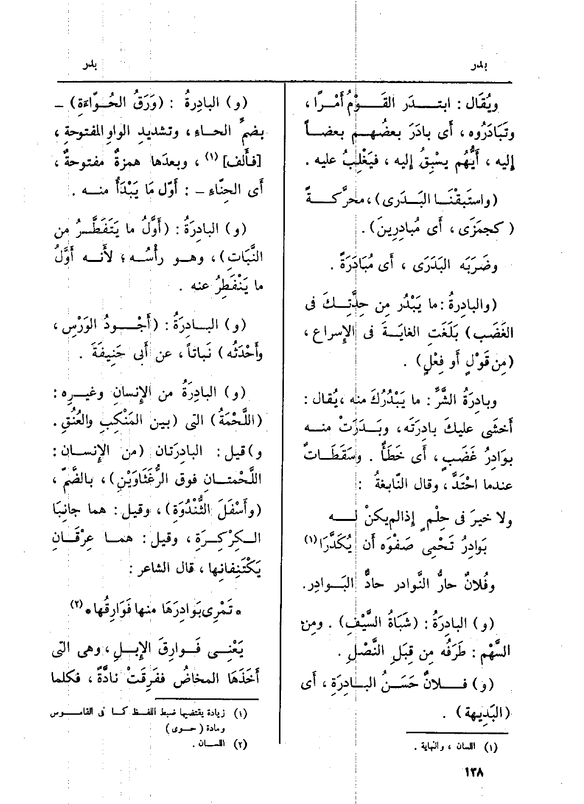 (و) البادِرَةُ من الإِنسانِ وغيرِه (اللَّحْمَةُ) الَّتِي (بَين المَنْكِبِ والعُنُقِ. و) قيل؛ البادِرَتان (من الإِنسان: اللَّحْمتانِ فَوق الرُّغَثَاوَيْنِ) ، بالضَّمّ، (وأَسْفَلَ الثُّنْدُوَةِ) ، وَقيل: هما جانِبَا الكِرْكِرَةِ، وَقيل: هما عِرْقَانِ يَكْتَنِفانِها، قَالَ الشَّاعِر: