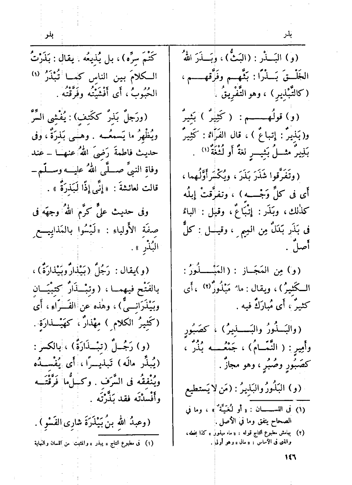 (و) قولُهم: (كَثيرٌ) بَثِيرٌ و (بَذِيرٌ: إِتباعٌ) ، قَالَ الفَرّاءُ: كَثِيرٌ بَذِيرٌ مثلُ بَثِيرٍ لغةٌ أَو لُثْغَةٌ.