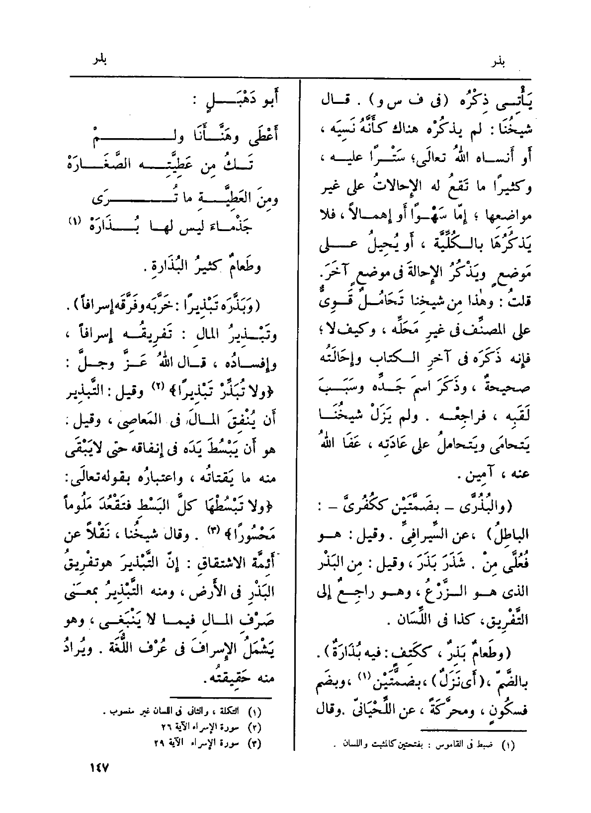 (والبُذُرَّى بضَمَّتَيْن ككُفُريَّ: الباطِلُ) ، عَن السِّيرافِيِّ. وَقيل: هُوَ فُعُلَّى مِنْ. شَذَرَ بَذَرَ، وَقيل: مِن البَذْر الَّذِي هُوَ الزَّرْعُ، وَهُوَ راجِعٌ إِلى التَّفْرِيق، كَذَا فِي اللِّسَان.