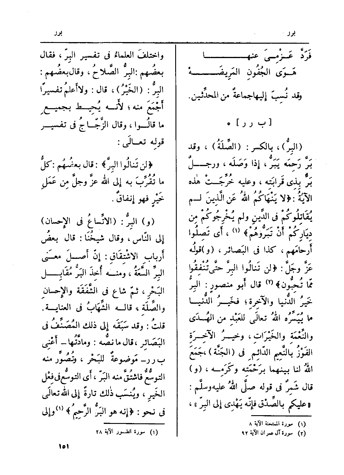 : ( {البِرُّ) ، بِالْكَسْرِ: (الصِّلَةُ) ، وَقد} بَرَّ رَحِمَه {يَبَرُّ، إِذا وَصَلَه، ورجلٌ} بَرٌّ بِذِي قَرابَتِه، وَعَلِيهِ خُرِّجَتْ هاذه الآيةُ: {لاَّ يَنْهَاكُمُ اللَّهُ عَنِ الَّذِينَ لَمْ يُقَاتِلُوكُمْ فِى الدّينِ وَلَمْ يُخْرِجُوكُمْ مّن دِيَارِكُمْ أَن! تَبَرُّوهُمْ} (الممتحنة: 8) ، أَي تَصِلُوا أَرحامَهم، كَذَا فِي البَصائر، (و) قولهُ عَزَّ وجَلَّ: {لَن تَنَالُواْ الْبِرَّ حَتَّى تُنفِقُواْ مِمَّا تُحِبُّونَ} (آل عمرَان: 92) قَالَ أَبو منصورٍ: البِرُّ خَيرُ الدُّنيا والآخِرةِ؛ فخَيرُ الدُّنيا مَا يُيَسِّرُه اللهُ تعالَى للعَبْدِ من الهُدَى والنِّعْمَةِ والخَيْرَاتِ، وخيرُ الآخِرَةِ الفَوْزُ بالنَّعِيم الدّائِمِ فِي (الجَنَّة) ، جَمَعَ اللهُ لنا بَينهمَا برَحْمَتِه وكَرَمِه، (و) قَالَ شَمِرٌ فِي قَوْله صلَّى اللهُ عليْه وسلَّم: (عَلَيْكُم بالصِّدْق فإِنّه يَهْدِي إِلى البِرّ) ، واختلفَ العلماءُ فِي تَفْسِير البِرّ، فَقَالَ بعضُهم: البِرُّ الصَّلاحُ، وَقَالَ بعضُهم: البِرُّ: (الخَيْرُ) ، قَالَ: وَلَا أَعلمُ تَفْسِيرا أَجْمَعَ مِنْهُ؛ لأَنه يُحِيط بجميعِ مَا قالُوا، وَقَالَ الزَّجّاجُ فِي تَفْسِير قولِه تعالَى: