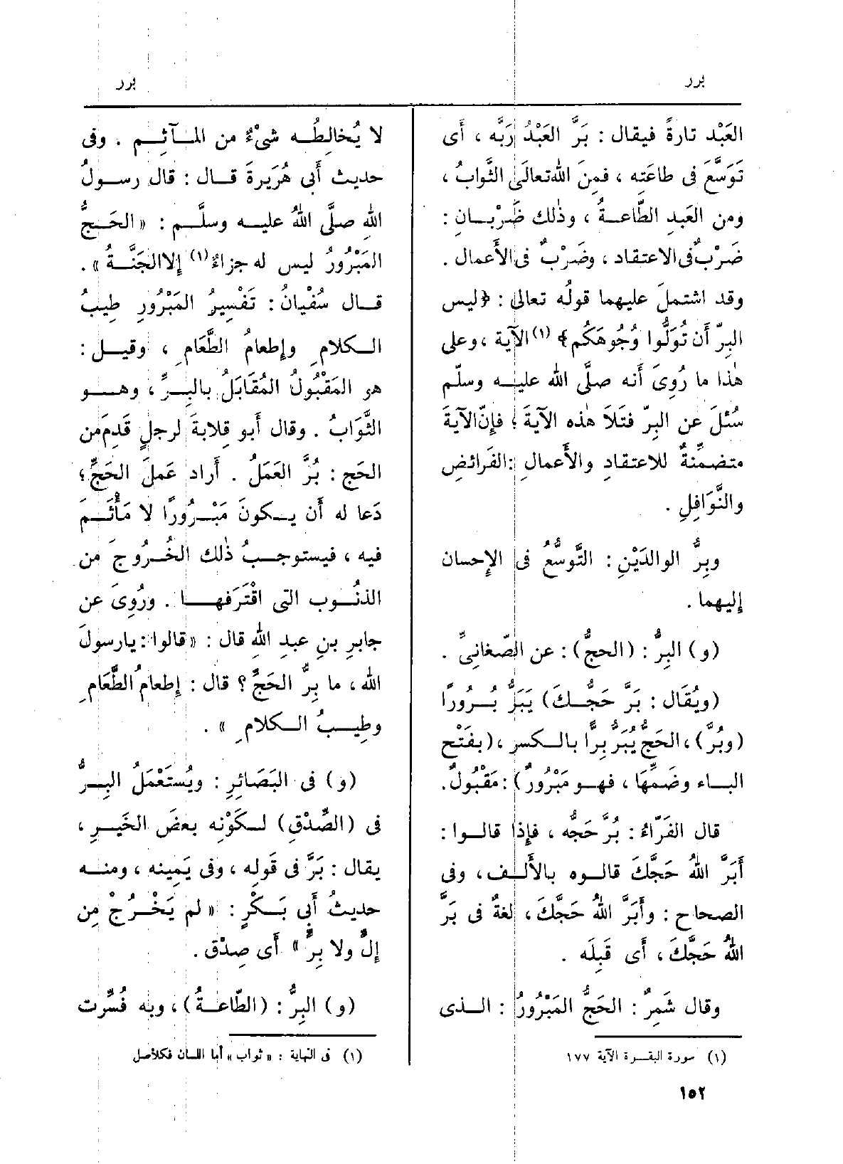 العَبْد تَارَة فَيُقَال: {بَرَّ العَبْدُ رَبَّه، أَي تَوَسَّعَ فِي طاعَته، فمِنَ الله تعالَى الثَّوابُ، وَمن العَبدِ الطّاعةُ، وذالك ضَرْبانِ: ضَرْبٌ فِي الِاعْتِقَاد، وضَرْبٌ فِي الأَعمال. وَقد اشتملَ عَلَيْهِمَا قولُه تَعَالَى: {لَّيْسَ الْبِرَّ أَن تُوَلُّواْ وُجُوهَكُمْ} (الْبَقَرَة: 177) الْآيَة، وعَلى هاذا مَا رُوِيَ أَنه صلَّى الله عليْه وسلّم سُئلَ عَن البِرّ فتَلَا هاذه الآيةَ؛ فإِنْ الآيةَ متضمِّنةٌ للاعتقادِ والأَعمالِ: الفَرائضِ والنَّوَافِلِ.