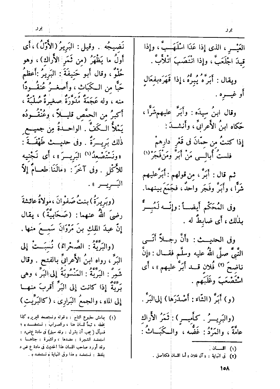 وَفِي الحَدِيث: (أَنَّ رجلا أَتَى النَّبيَّ صلَّى اللهُ عليْه وسلَّم فَقَالَ: (إِنَّ ناضِحَ فُلانٍ قد أَبَرَّ عَلَيْهِم) ، أَي اسْتَصْعَبَ وغَلَبَهم.