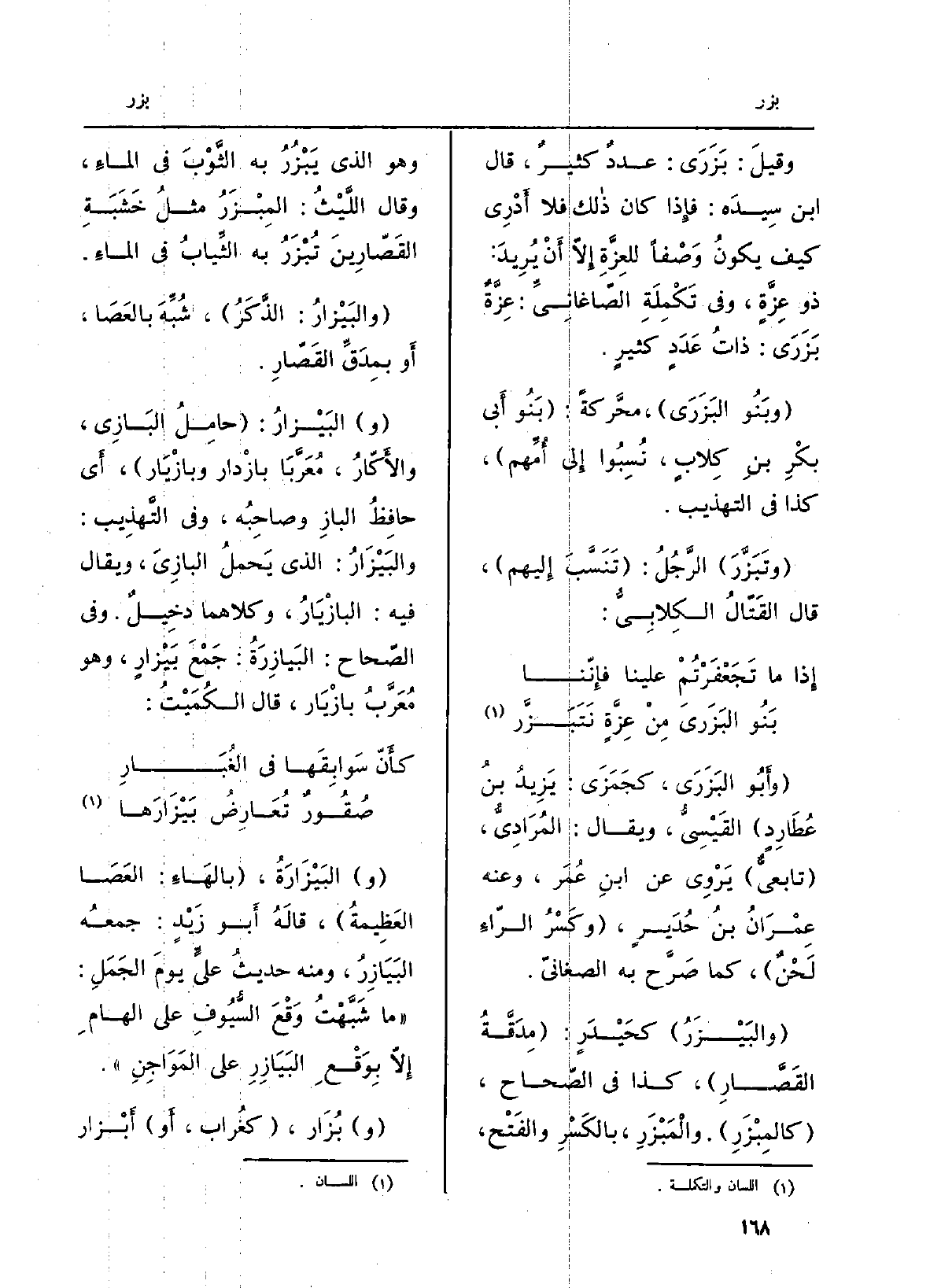 (وبَنُو البَزَرَى) ، محرَّكةً: (بَنُو أَبي بكْرِ بنِ كِلابٍ، نُسِبُوا إِلى أُمِّهم) ، كَذَا فِي التَّهْذِيب.