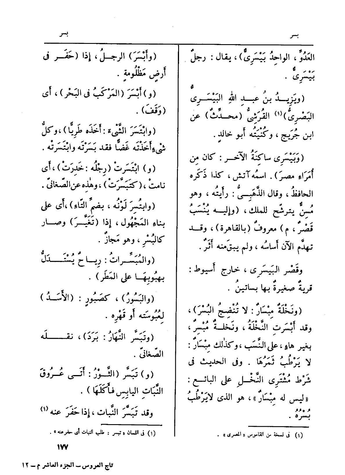 (و) تَبَسَّر (الثَّوْرُ: أَتَى عُرُوقَ النَّبَاتِ اليابِسِ فأَكَلَهَا) .