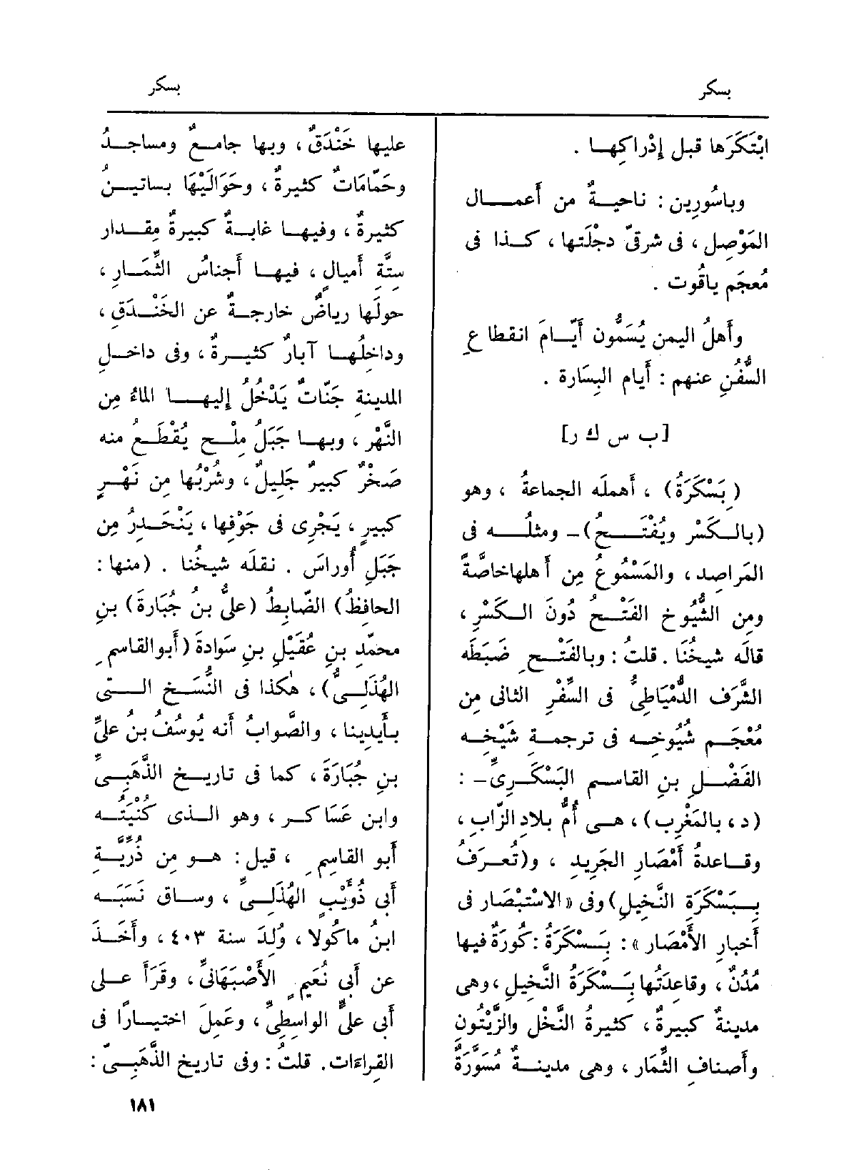: (بَسْكَرَةُ) ، أَهملَه الجماعةُ، وَهُوَ (بالكَسْر ويُفْتَحُ) ومثلُه فِي المَراصِد، والمَسْمُوعُ مِن أَهلها خاصَّةً ومِن الشُّيُوخ الفَتْحُ دُونَ الكَسْرِ، قالَه شيخُنَا. قلتُ: وبالفَتْحِ ضَبَطَه الشَّرَف الدُّمْيَاطِيُّ فِي السِّفْرِ الثَّانِي مِن مُعْجَم شُيُوخِه فِي ترجمةِ شَيْخِه الفَضْلِ بنِ الْقَاسِم البَسْكَرِيِّ: (د، بالمَغْرِب) ، هِيَ أُمُّ بِلَاد الزّابِ، وقاعدةُ أَمْصَارِ الجَرِيدِ، و (تُعرَفُ بِبَسْكَرَةِ النَّخِيلِ) وَفِي (الاسْتبْصَار فِي أَخبارِ الأَمْصَار) : بَسْكَرَةُ: كُورَةٌ فِيهَا مُدُنٌ، وقاعِدَتُها بَسْكَرَةُ النَّخِيلِ، وَهِي مدينةٌ كبيرةٌ، كثيرةُ النَّخْل والزَّيْتُونِ وأَصنافِ الثِّمَار، وَهِي مدينةٌ مُسَوَّرَةٌ عَلَيْهَا خَنْدَقٌ، وَبهَا جامعٌ ومساجدُ وحَمّامَاتٌ كثيرةٌ، وحَوَالَيْهَا بساتينُ كثيرةٌ، وفيهَا غابةٌ كبيرةٌ مِقدار سِتَّةِ أَميالٍ، فِيهَا أَجناسُ الثِّمَارِ، حولَها رياضٌ خارجةٌ عَن الخَنْدَقِ، وداخِلُها آبارٌ كثيرةٌ، وَفِي دَاخل المدينةِ جَناتٌ يَدْخُلُ إِليها الماءُ مِن النهْر، وَبهَا جَبَلُ مِلْح يُقْطَعُ مِنْهُ صَخْرٌ كبيرٌ جَلِيلٌ، وشُرْبُها مِن نَهْرٍ كبيرٍ، يَجْرِي فِي جَوْفِها، يَنْحَدِرُ مِن جَبَلِ أُوراسَ. وقلَه شيخُنا. (مِنْهَا: الحافِظُ) الضّابِطُ (عليُّ بنُ جُبَارةَ) بنِ محمّدِ بنِ عُقَيْلِ بنِ سَوادةَ (أَبو القاسمِ الهُذَلِيُّ) ، هاكذا فِي النُّسَخ الَّتِي بأَيدِينا، والصَّوابُ أَنه يُوسُفُ بنُ عليِّ بنِ جُبَارَاَ، كَمَا فِي تَارِيخ الذَّهَبِيِّ وَابْن عَساكر، وَهُوَ الَّذِي كُنْيَتُه أَبو القاسِمِ، قيل: هُوَ مِن ذُرِّيَّةِ أَبي ذُؤَيْبٍ الهُذَلِيِّ، وسَاق نَسَبَه ابنُ ماكُولا، وُلِدَ سنة 403 هـ، وأَخَذَ عَن أَبي نُعَيمٍ الأَصْبَهَانيِّ، وقَرَأَ على أَي عليَ الواسِطِيِّ، وعَمِلَ اخْتِيَارا فِي القِراءَات. قلتُ: وَفِي تَارِيخ الذَّهَبِيّ: