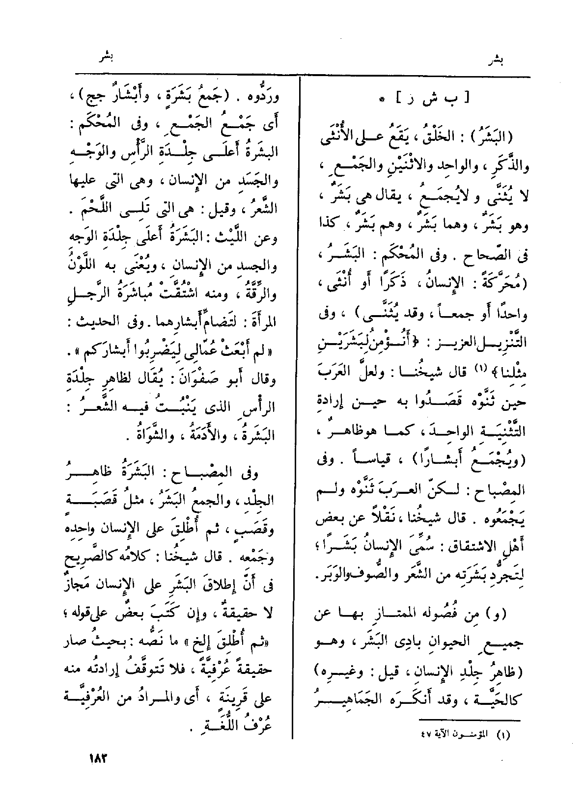 : (البَشَرُ) : الخَلْقُ، يَقَعُ على الأُنْثَى والذَّكَرِ، والواحِد والإِثْنَيْنِ والجَمْعِ، لَا يُثَنَّى وَلَا يُجمَعُ، يُقَال هِيَ بشَرٌ، وَهُوَ بَشَرٌ، وهما بَشَرٌ، وهم بَشَرٌ، كَذَا فِي الصّحاح. وَفِي المُحكَم: البَشَرُ، (مُحَرَّكَةً: الإِنسانُ، ذَكَراً أَو أُنْثَى، وَاحِدًا أَو جمعا، وَقد يُثَنَّى) ، وَفِي التَّنْزِيل الْعَزِيز: {أَنُؤْمِنُ لِبَشَرَيْنِ مِثْلِنَا} (الْمُؤْمِنُونَ: 47) قَالَ شيخُنا: ولعلَّ العَرَبَ حِين ثَنَّوّه قَصَدُوا بِهِ حِين إِرادةِ التَّثْنِيَةِ لواحِدَ، كَمَا هُوَ ظاهرٌ،: