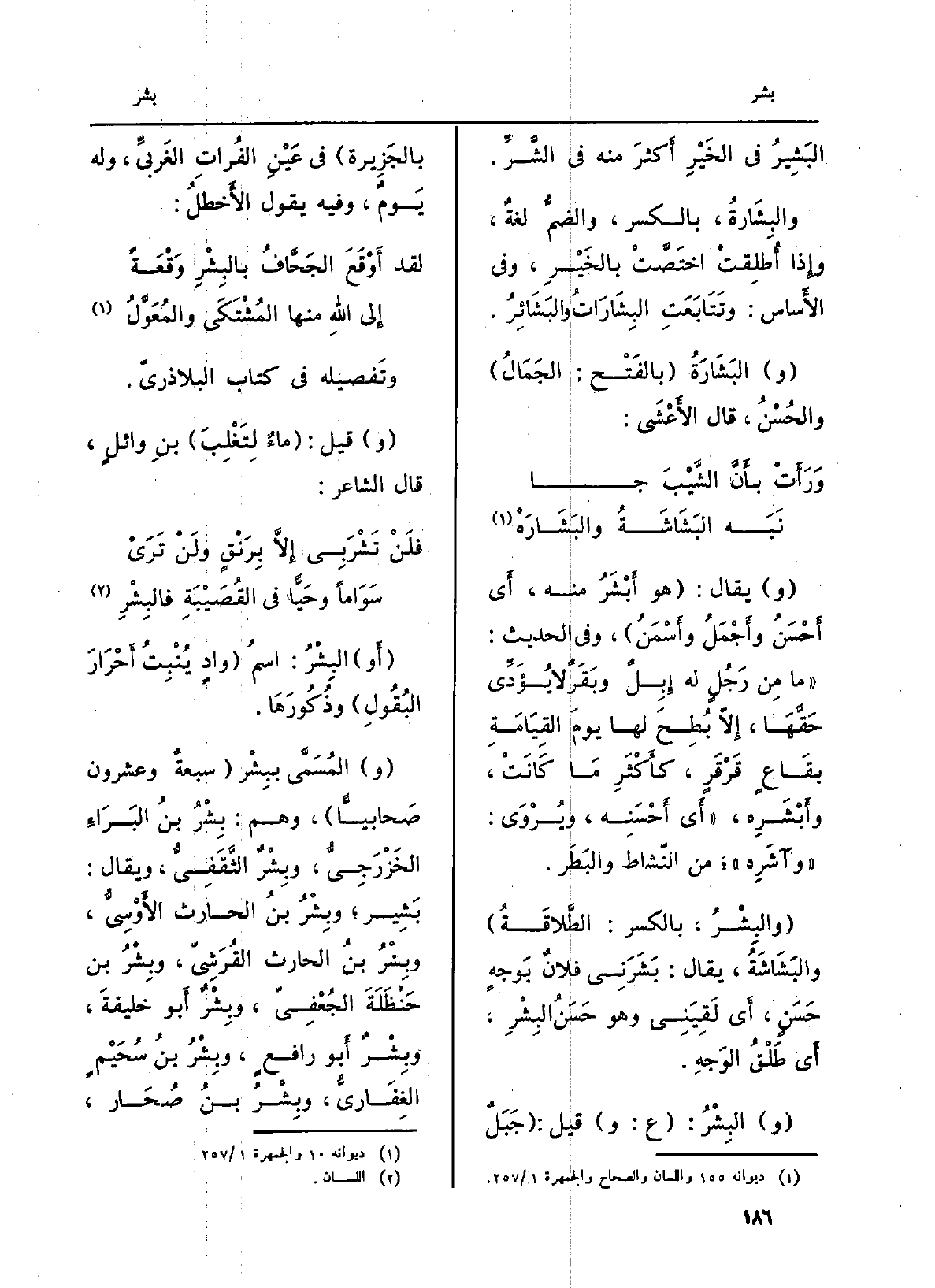 (و) البَشَارَةُ (بالفَتْح: الجَمَالُ) والحُسْنُ، قَالَ الأَعْشَى: