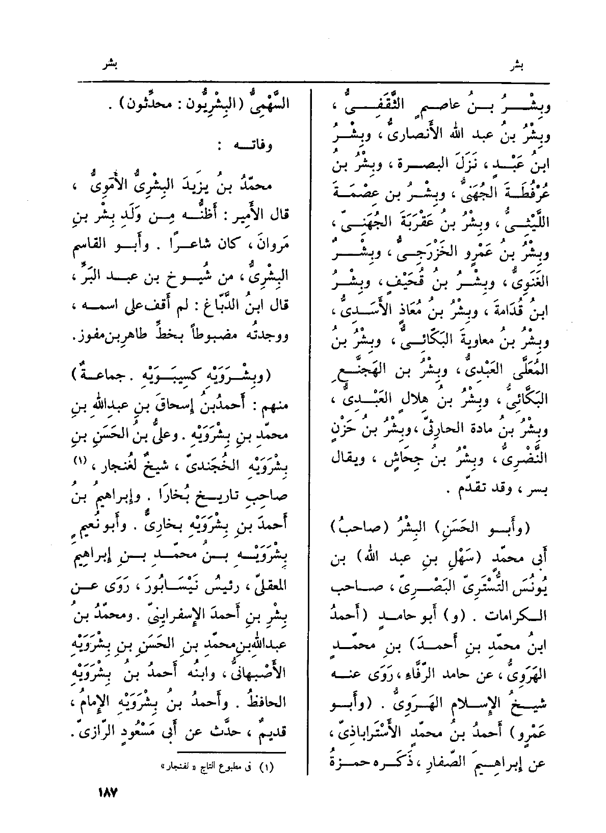 (وأَبو الحَسَنِ) البِشْرُ (صاحبُ) أَبي محمّدٍ (سَهْلِ بنِ عبد الله) بن يُونُسَ التُّسْتَرِيّ البَصْرِيّ، صَاحب الكرامات. (و) أَبو حامدٍ (أَحمدُ بنُ محمّدِ بنِ أَحمدَ) بنِ محمّدٍ الهَرَوِيُّ، عَن حَامِد الرّفَّاءِ، رَوَى عَنهُ شيخُ الإِسلام الهَرَوِيُّ. (وأَبو عَمْرٍ و) أَحمدُ بنُ محمّدٍ الأَسْتَراباذِيّ، عَن إِبراهيمَ الصّفارِ، ذَكَره حمزةُ السَّهْمِيُّ (البِشْرِيُّون: محدِّثون) .