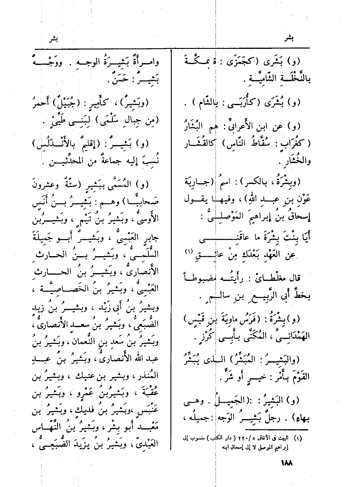 (وبِشْرَةُ، بِالْكَسْرِ) : إسمُ (جارِيَة عَوِنْ بنِ عبدِ اللهِ) ، وفيهَا يَقُول إِسحاقُ بنُ إِبراهيمَ المَوْصلِيُّ: