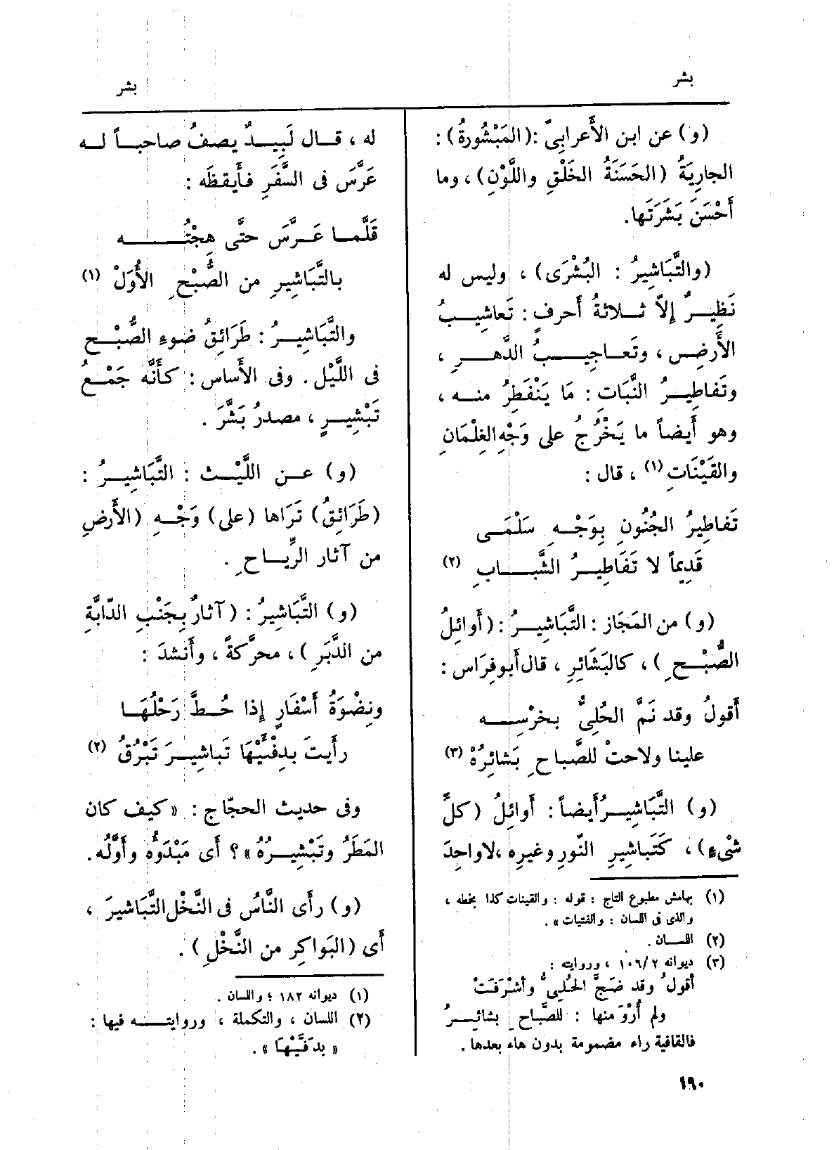 (والتَّبَاشِيرُ: البُشْرَى) ، وَلَيْسَ لَهُ نَظِيرٌ إِلّا ثلاثةُ أَحرفٍ: تَعاشِيبُ الأَرضِ، وتَعاجِيبُ الدَّهرِ، وتَفاطِيرُ النَّبَاتِ: مَا يَنْفَطِرُ مِنْهُ، وَهُوَ أَيضاً مَا يَخْرُجُ على وَجْهِ الغِلْمَانِ والقَيْنَاتِ، قَالَ: