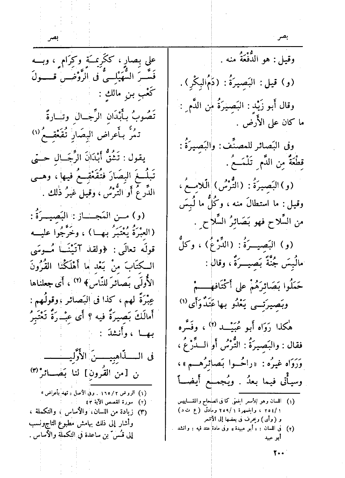 (و) من المَجاز: البَصِيرَةُ: (العِبْرَةُ يُعْتَبَرُ بهَا) ، وخَرَّجُوا عَلَيْهِ قولَه تعالَى: {وَلَقَدْ ءاتَيْنَا مُوسَى الْكِتَابَ مِن بَعْدِ مَآ أَهْلَكْنَا الْقُرُونَ الاْولَى بَصَآئِرَ} (الْقَصَص: 43) ، أَي جعلناها عِبْرَةً لَهُم، كَذَا فِي البَصائر، وقولُهم: أَمالَكَ بَصِيرَةٌ فِيهِ؟ أَي عِبْرَةٌ تَعْتَبِرُ بهَا، وأَنشدَ: