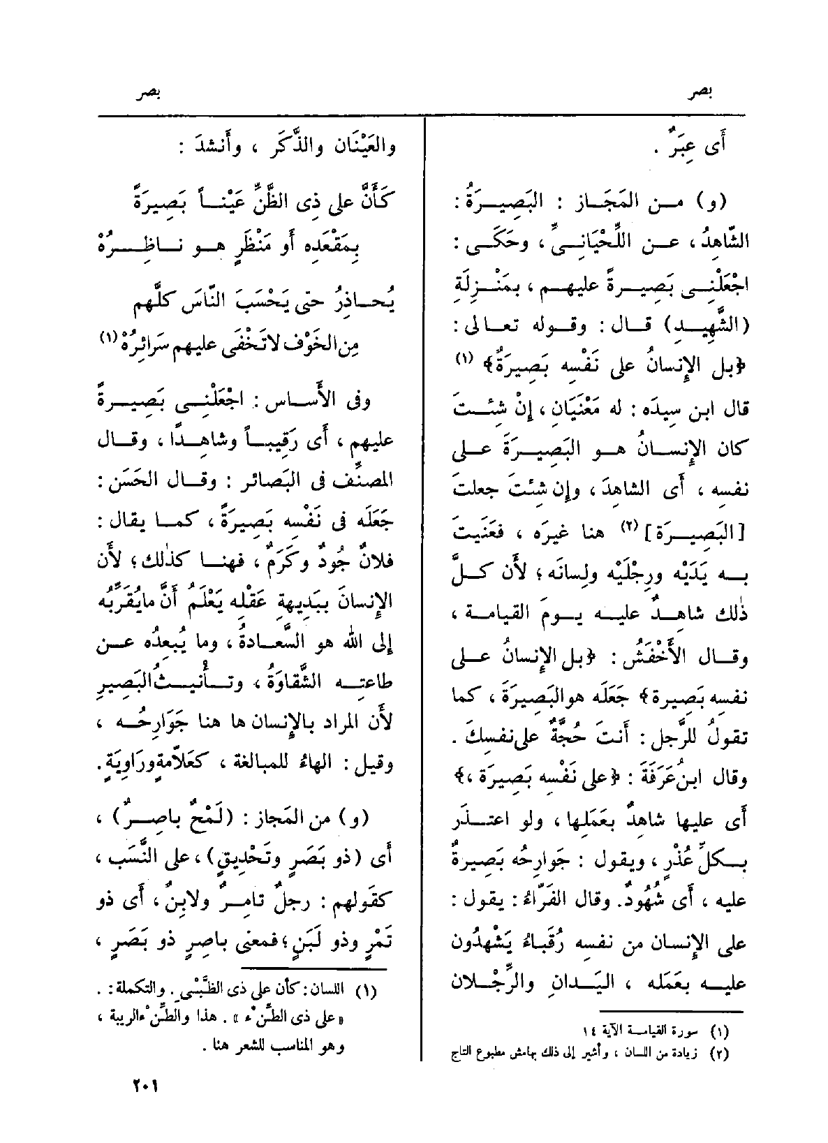 (و) مِنَ المَجَازِ: البَصِيرَةُ: الشاهِدُ، عَن اللِّحْيَانِيِّ، وحَكَى: اجْعَلْنِي بَصِيرةً عَلَيْهِم، بمَنْزِلَةِ (الشَّهِيدِ) قَالَ: وَقَوله تَعَالَى: {بَلِ الإِنسَانُ عَلَى نَفْسِهِ بَصِيرَةٌ} (الْقِيَامَة: 14) قَالَ ابْن سِيدَه: لَهُ مَعْنَيَانِ، إِنْ شِئتَ كَانَ الإِنسانُ هُوَ البَصِيرَةَ على نفسِه، أَي الشاهِدَ، وإِن شِئتَ جعلتَ (البَصِيرَة) هُنَا غيرَه، فعَنَيتَ بِهِ يَدَيْه ورِجْلَيْه ولِسانَه؛ لأَن كلَّ ذالك شاهِدٌ عَلَيْهِ يومَ الْقِيَامَة، وَقَالَ الأَخْفَشُ: {بَلِ الإِنسَانُ عَلَى نَفْسِهِ بَصِيرَةٌ} جَعَلَه هُوَ البَصِيرَةَ، كَمَا تقولُ للرَّجل: أَنتَ حُجَّةٌ على نفسِكَ. وَقَالَ ابنُ عَرَفَةَ: {عَلَى نَفْسِهِ بَصِيرَةٌ} أَي عَلَيْهَا شاهِدٌ بعَمَلِها، وَلَو اعتذَر بكلَ عُذْرٍ، وَيَقُول: جَوارِحُه بَصِيرةٌ عَلَيْهِ، أَي شُهُودٌ. وَقَالَ الفَرّاءُ: يَقُول: على الإِنسان من نفسِه رُقَباءُ يَشْهدُون عَلَيْهِ بعَمَله، اليَدانِ والرِّجْلان والعَيْنَان والذَّكَر، وأَنشدَ: