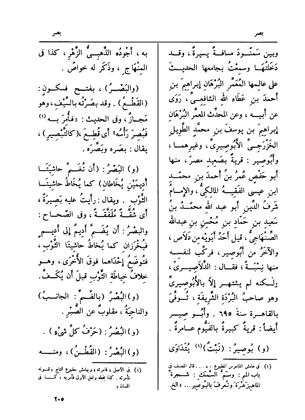 وَبَين سَمنّودَ مسافةٌ يسيرةٌ، وَقد دَخَلتُهَا وسمِعْتُ بجامعها الحديثَ على عالِمها المُعَمَّرِ البُرْهَانِ إِبراهِيمَ بنِ أَحمدَ بنِ عَطَاءِ اللهِ الشافِعِيِّ، رَوَى عَن أَبيه، وَعَن المحدِّث المعمَّر البُرْهَانِ إِبراهِيمَ بن يوسفَ بنِ محمَّدٍ الطَّوِيلِ الخَزْرَجِيِّ الأَبُوصِيرِيِّ، وغيرِهما، وأَبُو صِير: قريةٌ بصَعِيدِ مصرَ، مِنْهَا أَبو حَفْصٍ عُمرُ بنُ أَحمدَ بنِ محمّدِ بنِ عِيسَى الفَقِيهُ المالِكِيُّ، والإِمامُ شَرفُ الدِّينِ أَبو عبد اللهِ محمّدُ بنُ سَعيدِ بنِ حَمّادِ بنِ مُحْسِنِ بنِ عبد الله الصِّنْهَاجِيُّ، قيل أَحَدُ أَبَويّه مِن دَلَاص، والآخَرُ من أَبُو صِير، فركَّب لنفسِه مِنْهَا نِسْبَةً؛ فَقَالَ: الدَّلَاصِيريّ، ولاكنه لم يشْتَهر إلّا بالأَبُوصِيريِّ وَهُوَ صاحبُ البُرْدَةِ الشَّرِيفَةِ، تُوفِّيَ بِالْقَاهِرَةِ سنة 695 هـ. وأَبُو صِير أَيضاً: قريةٌ كبيرةٌ بالفَيُّوم عامرةٌ.