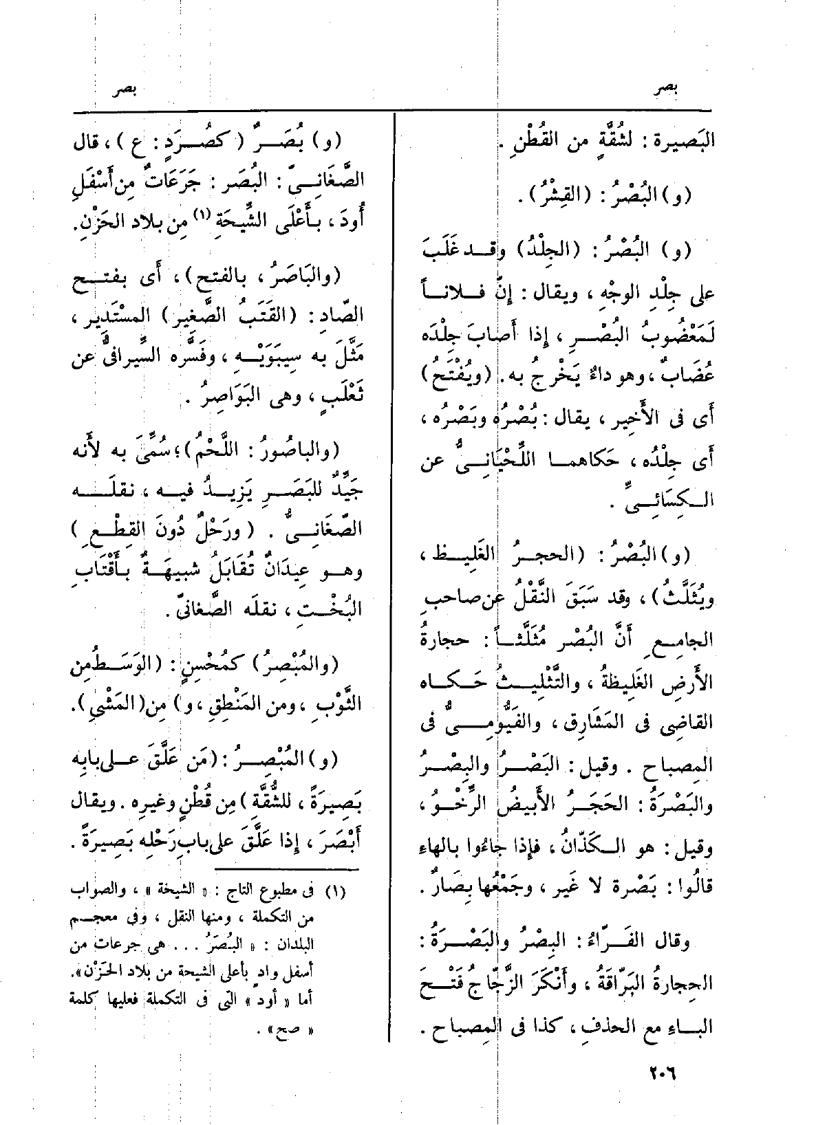 (و) البُصْرُ: (الحجَرُ الغَلِيظ، ويُثَلَّثُ) ، وَقد سَبَقَ النَّقْلُ عَن صاحبِ الجامِعِ أَنَّ البُصْر مُثَلَّثاً: حجارةُ الأَرضِ الغَلِيظةُ، والتَّثْلِيثُ حَكاه القاضِي فِي المَشَارِق، والفَيُّومِيُّ فِي المِصباح. وَقيل: البَصْرُ ولبِصْرُ والبَصْرَةُ: الحَجَرُ الأَبيضُ الرِّخْوُ وَقيل: هُوَ الكَذّانُ، فإِذا جاءُوا بالهاءِ قالُوا: بَصْرة لَا غَير، وجَمْعُها بِصَارٌ.
