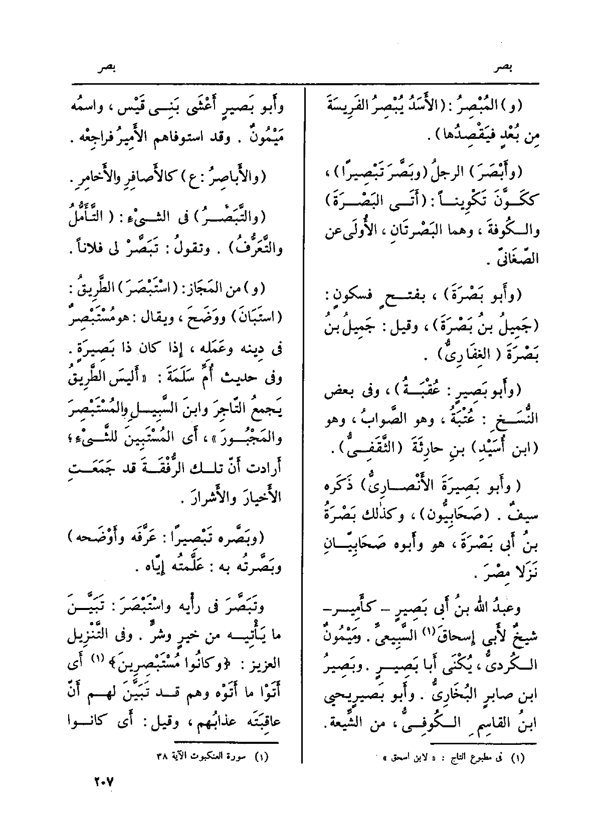 وتَبَصَّر فِي رأْيه واسْتَبْصَرَ: تَبَيَّنَ مَا يَأْتِيه من خيرٍ وشرَ. وَفِي التَّنْزِيل الْعَزِيز: {لَكُم مّن مَّسَاكِنِهِمْ وَزَيَّنَ لَهُمُ الشَّيْطَانُ أَعْمَالَهُمْ فَصَدَّهُمْ عَنِ السَّبِيلِ وَكَانُواْ مُسْتَبْصِرِينَ} (العنكبوت: 38) أَي أَتَوْا مَا أَتَوْه وهم قد تَبَيَّنَ لَهُم أَن عاقِبَتَه عذابُهم، وَقيل: أَي كَانُوا