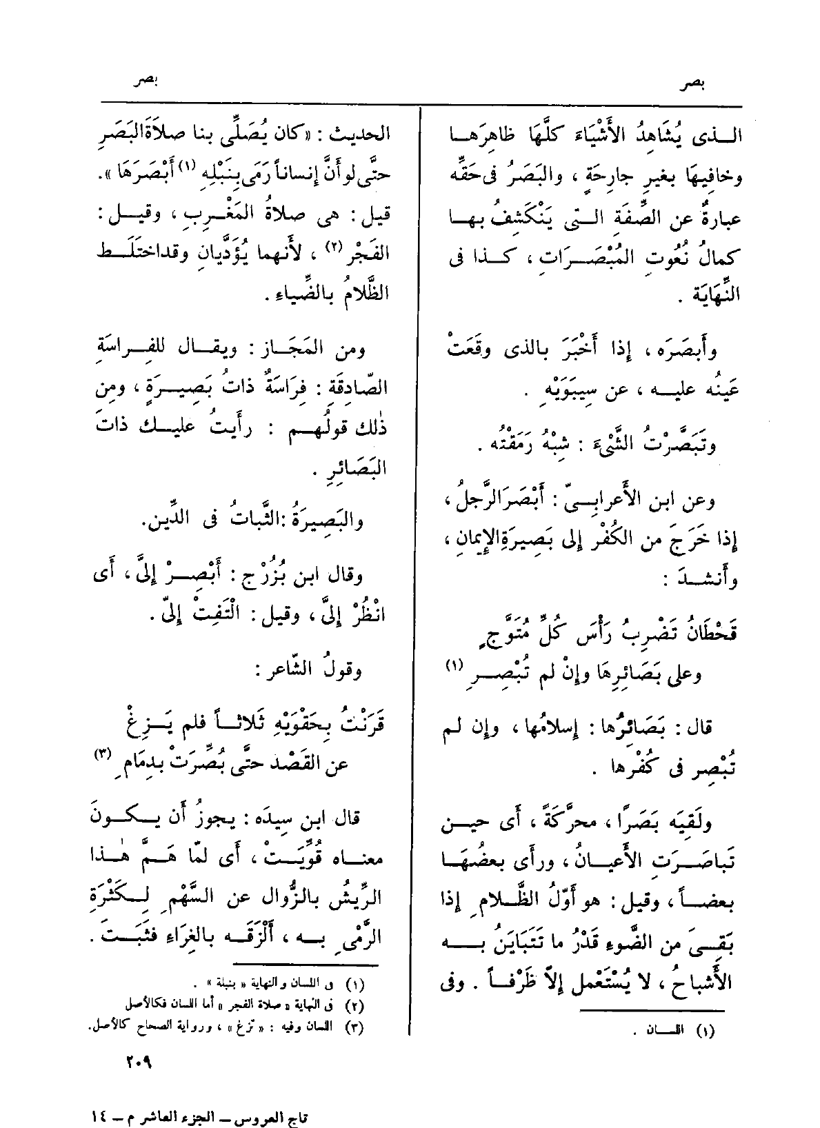 ولَقِيَه بَصَراً، محرَّكَةً، أَي حِين تَباصَرَتِ الأَعيانُ، ورأَى بعضُهَا بَعْضًا، وَقيل: هُوَ أَوّلُ الظَّلامِ إِذا بَقِيَ من الضَّوءِ قَدْرُ مَا تَتَبَايَنُ بِهِ الأَشباحُ، لَا يُسْتَعْمل إِلّا ظَرْفاً. وَفِي الحَدِيث: (كَانَ يُصَلِّي بِنَا صلَاةَ البَصَرِ حتَّى لَو أَنَّ إِنساناً رَمَى بِنَبْلِهِ أَبْصَرَهَا) . قيل: هِيَ صلاةُ المَغْرِبِ، وَقيل: الفَجْر، لأَنهما يُؤَدَّيانِ وَقد اختلَط الظَّلامُ بالضِّياءِ.