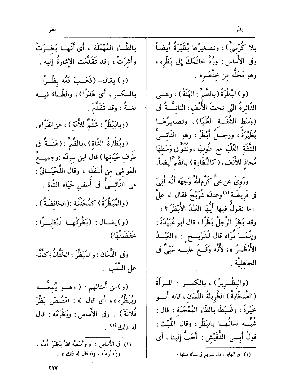 (و) البُظْرَةُ (بالضَّمِّ: الهَنَةُ) ، وَهِي الدّائِرةُ الَّتِي تحتَ الأَنْفِ، الناتِئَةُ فِي (وَسَط الشَّفَةِ العُلْيَا) ، وتصغيرُهَا بُظَيْرَةٌ، ورجلٌ أَبْظَرُ، وَهُوَ النّاتِيءُ الشَّفَةِ العُلْيَا مَعَ طُولِهَا، ونُتُوَ فِي وَسَطِهَا مُحاذٍ للأَنْف.، (كالبُظَارةِ) بالضَّمِّ أَيضاً.